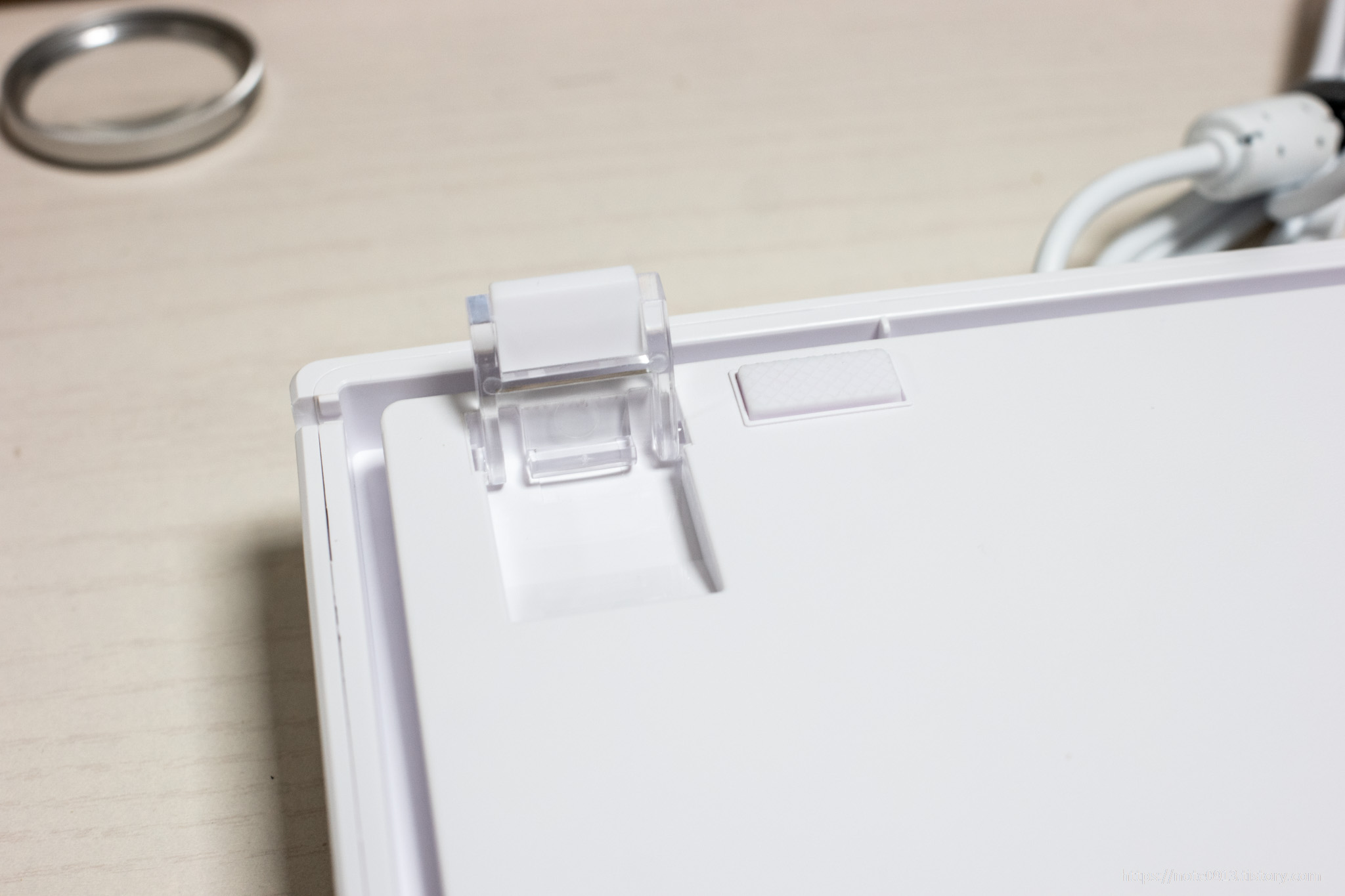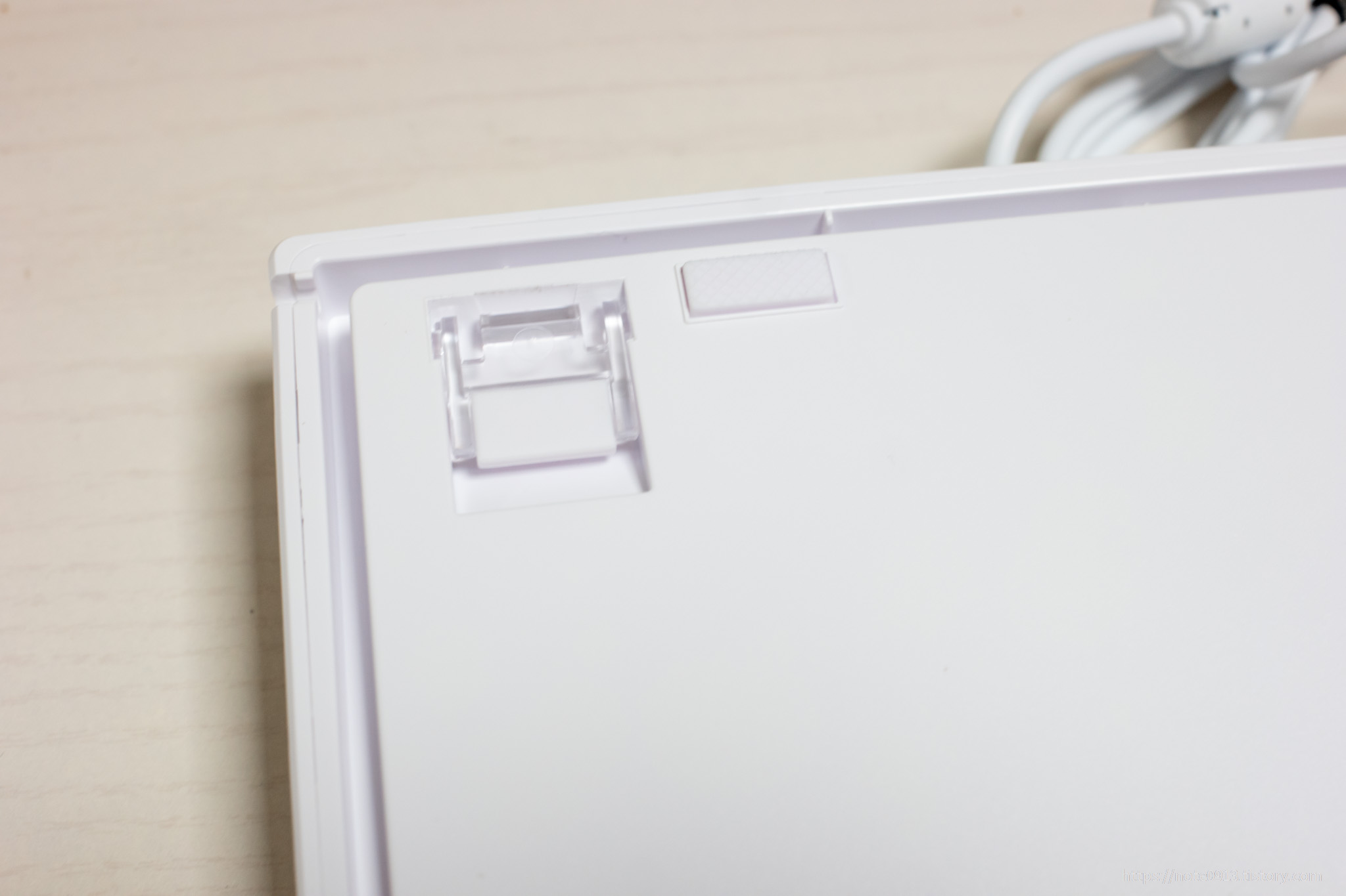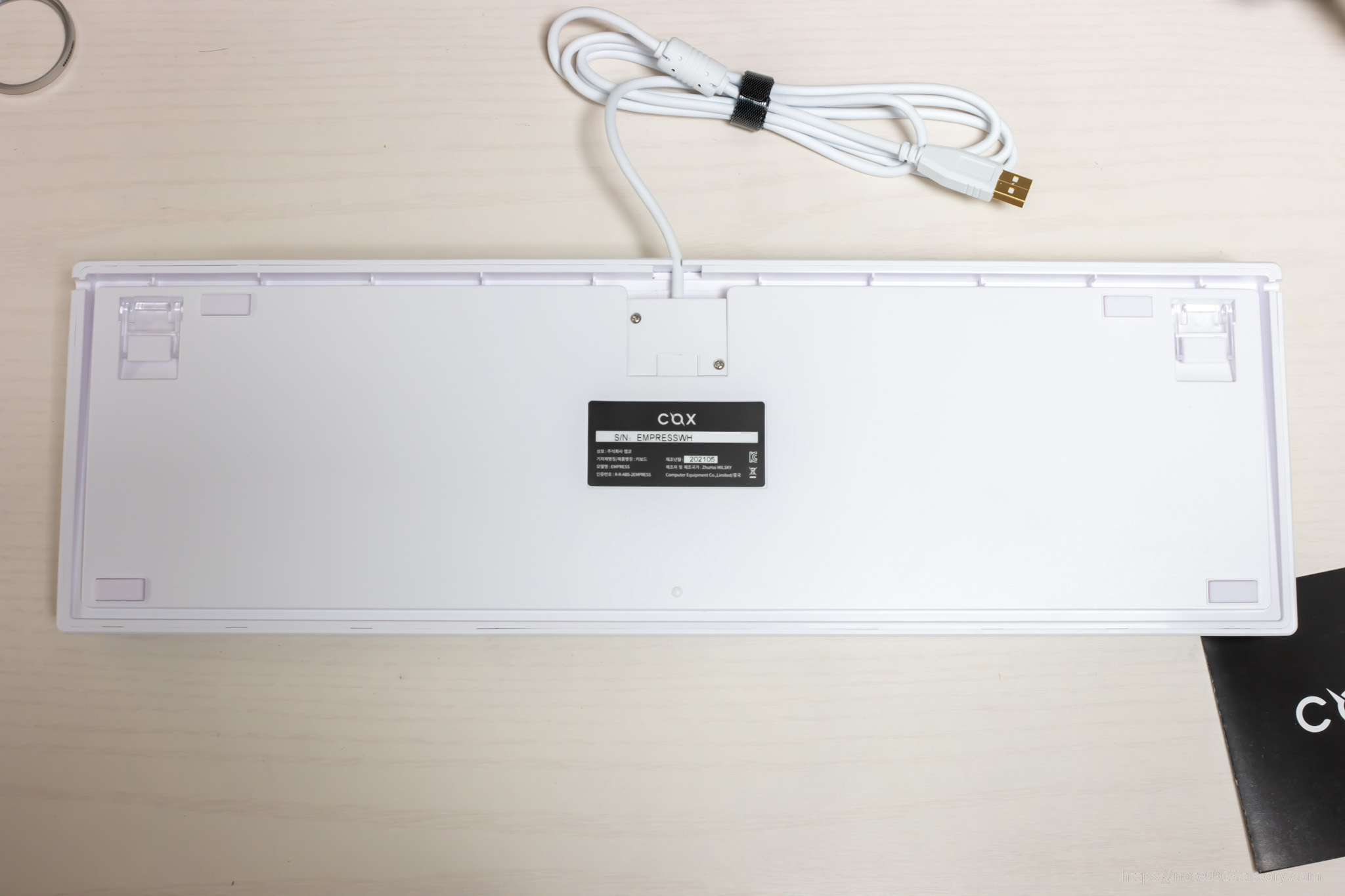 키보드 뒤쪽에는 키보드 높낮이 조절 받침대랑 시리얼 번호가 적혀있는 스티커가 있습니다. 또한 위의 홈을 통해서 키보드 선의 위치를 가운데 또는 좌측 이나 우측으로 키보드 선을 뺄 수 있습니다.