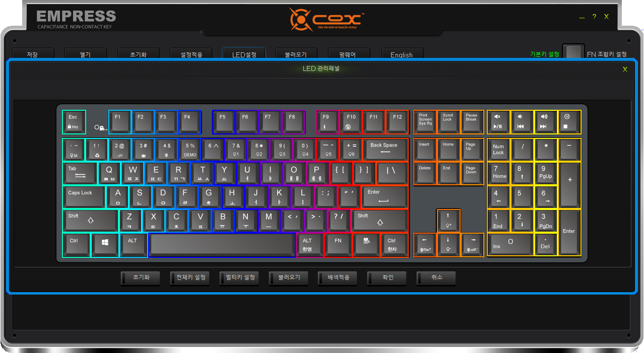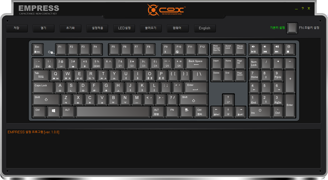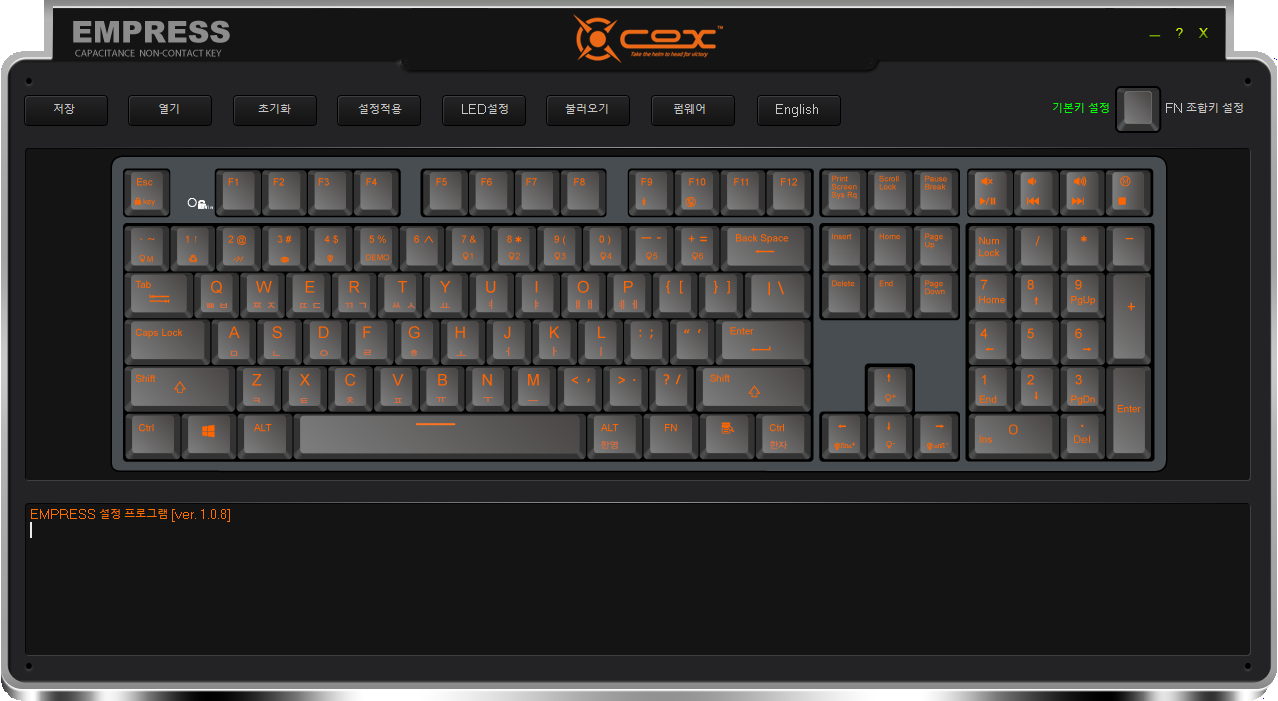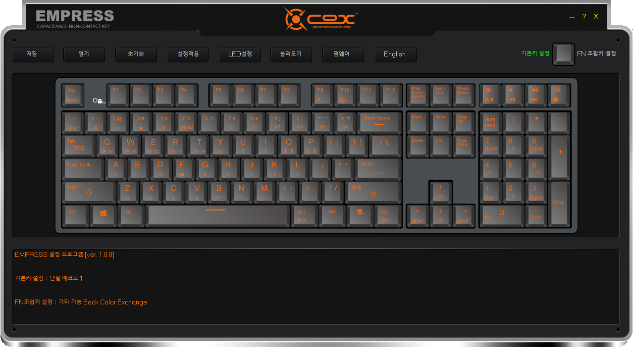콕스에서 제공하는 프로그램을 실행하면 위와 같은 화면이 나옵니다. 키보드가 연결된 상태에서 상단에 있는 불러오기를 클릭하면 현재 설정된 키 값들을 불러옵니다.