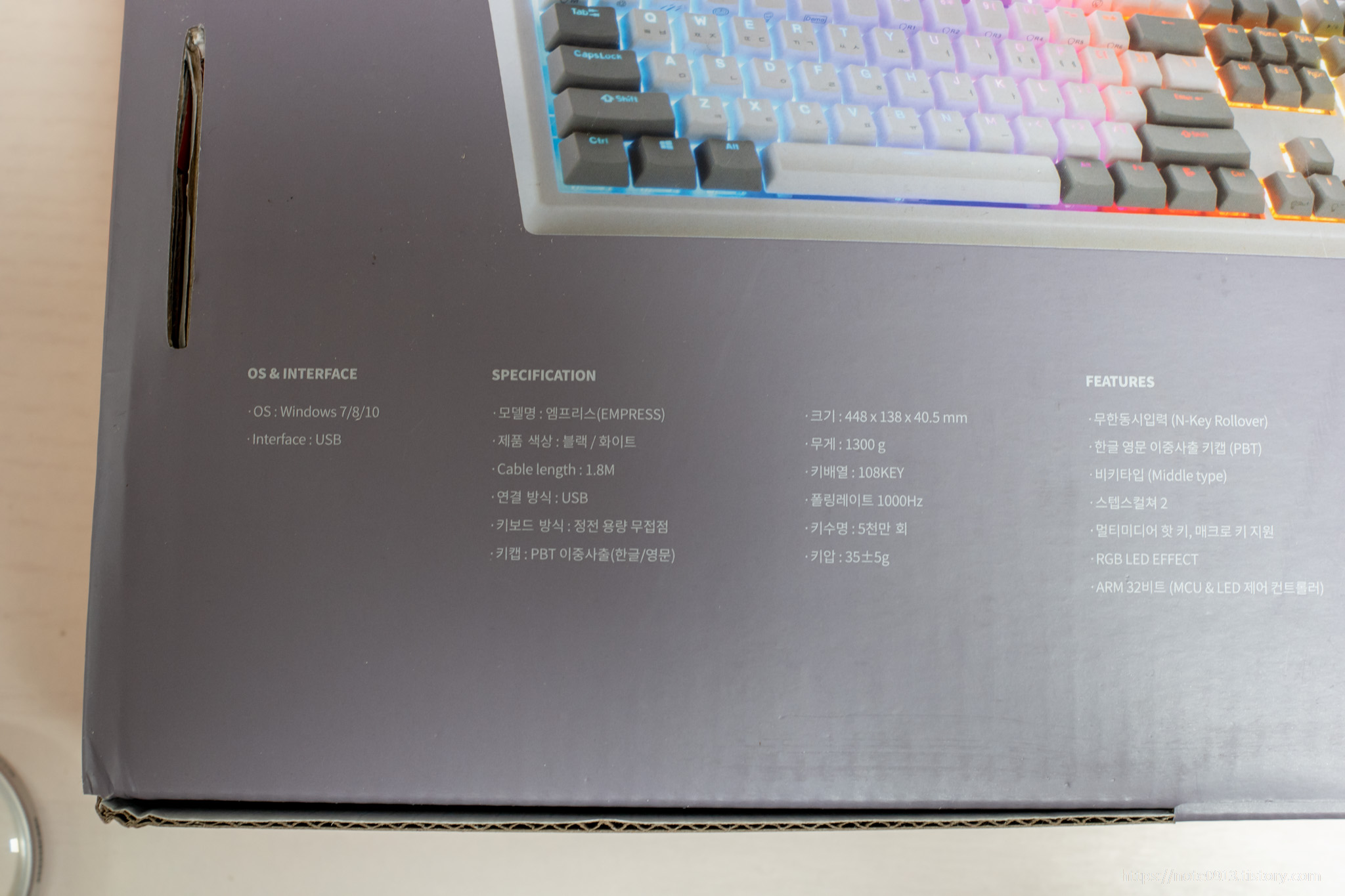 화이트 색상의 엠프리스 키보드입니다. 색깛이 진짜 예쁩니다. 화이트색상이 완전 차가운 하얀색 입니다. 그래서 뭔가 깔끔하면서 시원한 느낌이 들어요.