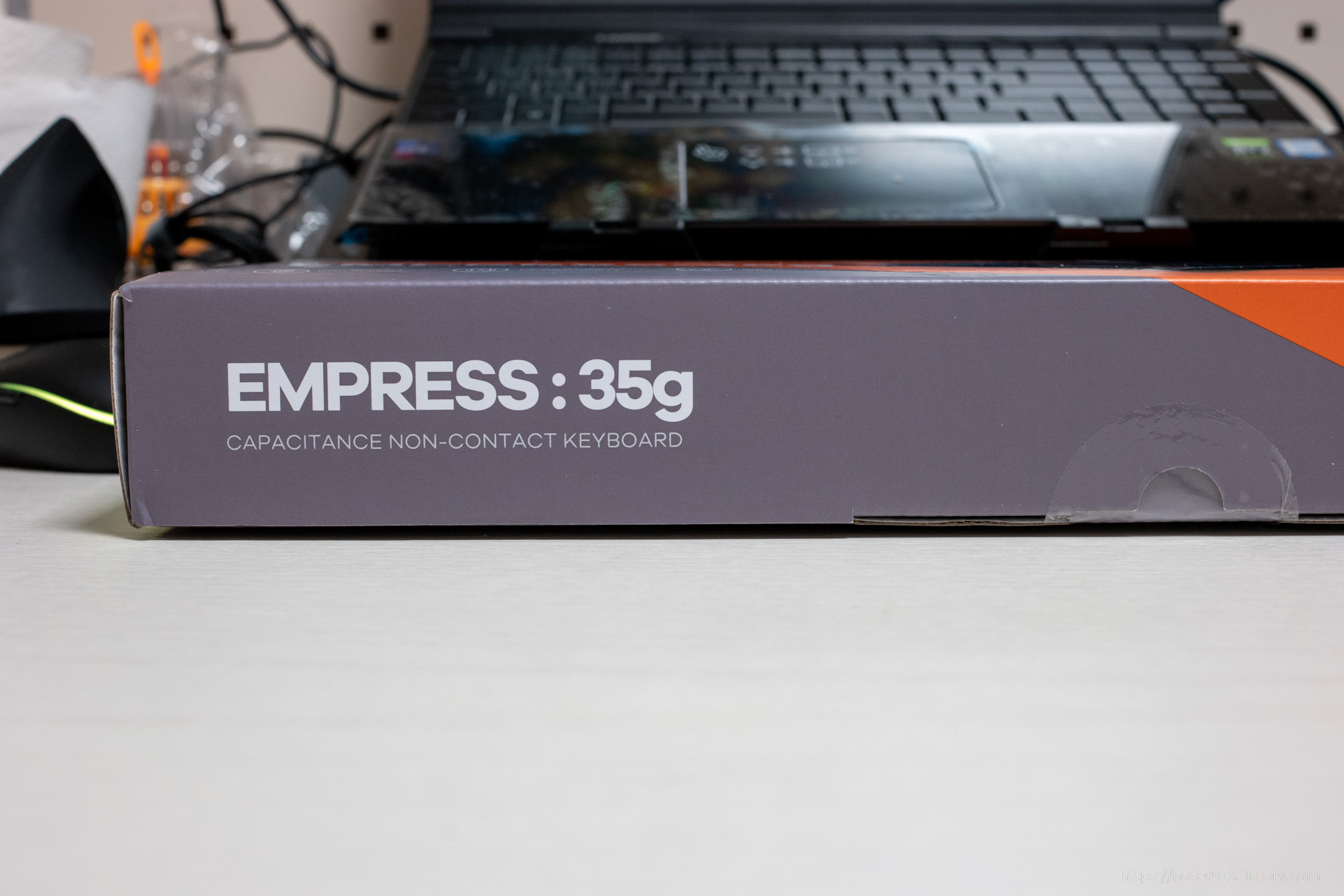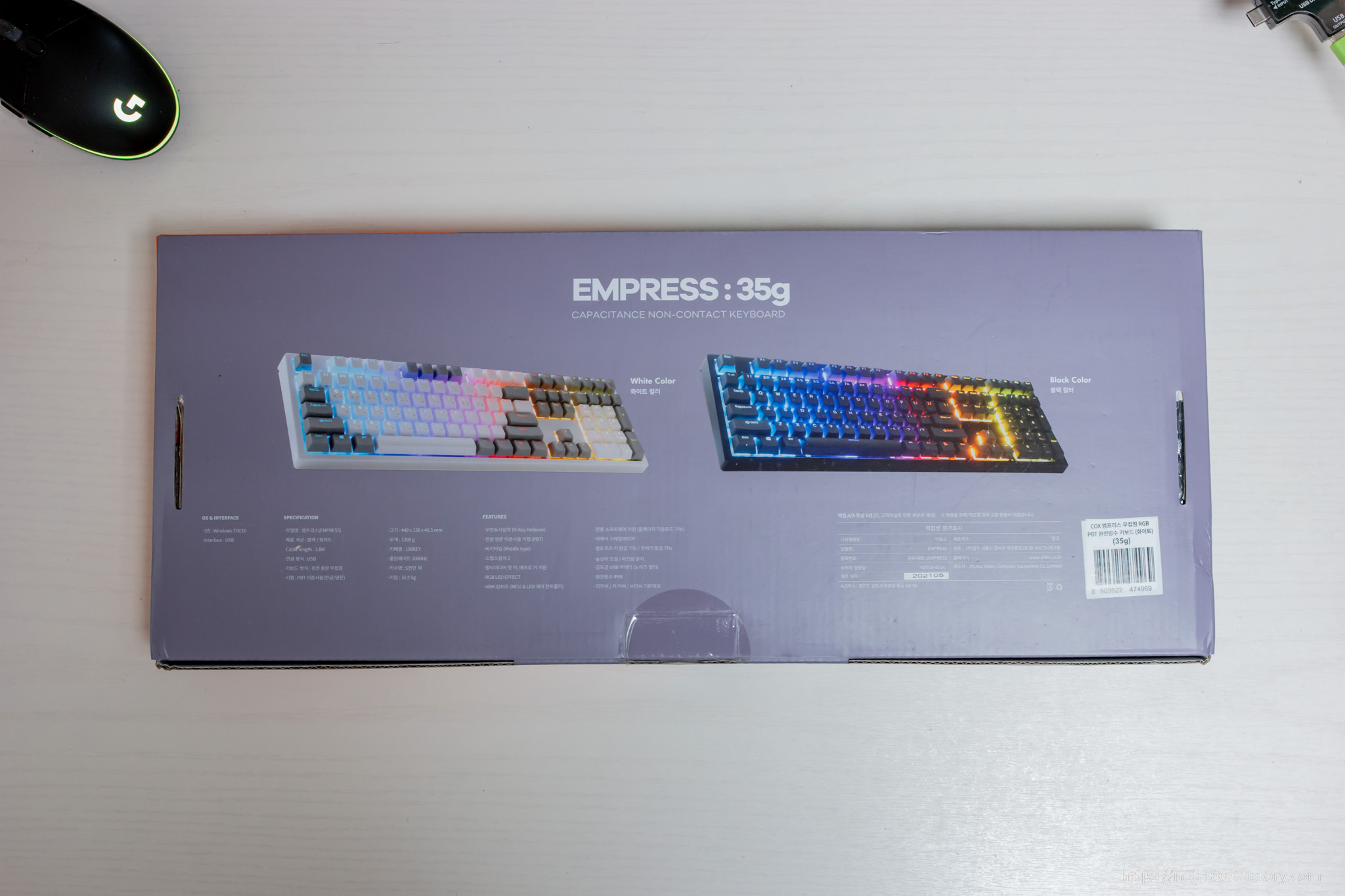 콕스 엪므리스 키보드 박스 앞면입니다. 앞면에는 검은색 엠프리스 사진이 있고 엠프리스 35g 이라는 문구가 적혀있습니다.