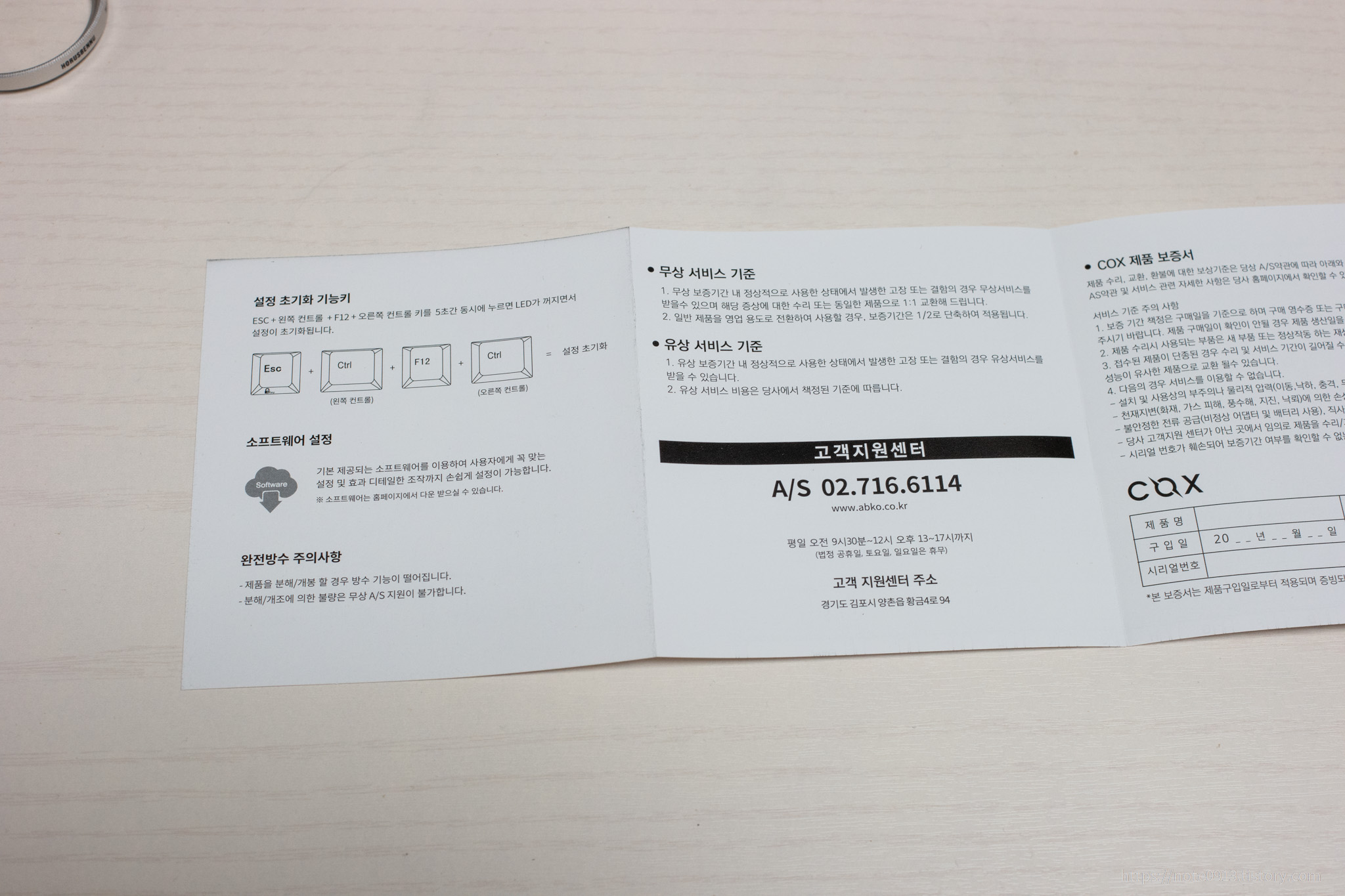 설명서입니다. 키보드 LED 사용법이랑 초기화 방법을 설명하고 있습니다. 키보드 초기화 방법은 Control(좌측) + ESC + Control(우측) + F12 를 5초동안 누르면 키보드가 초기화 됩니다.
