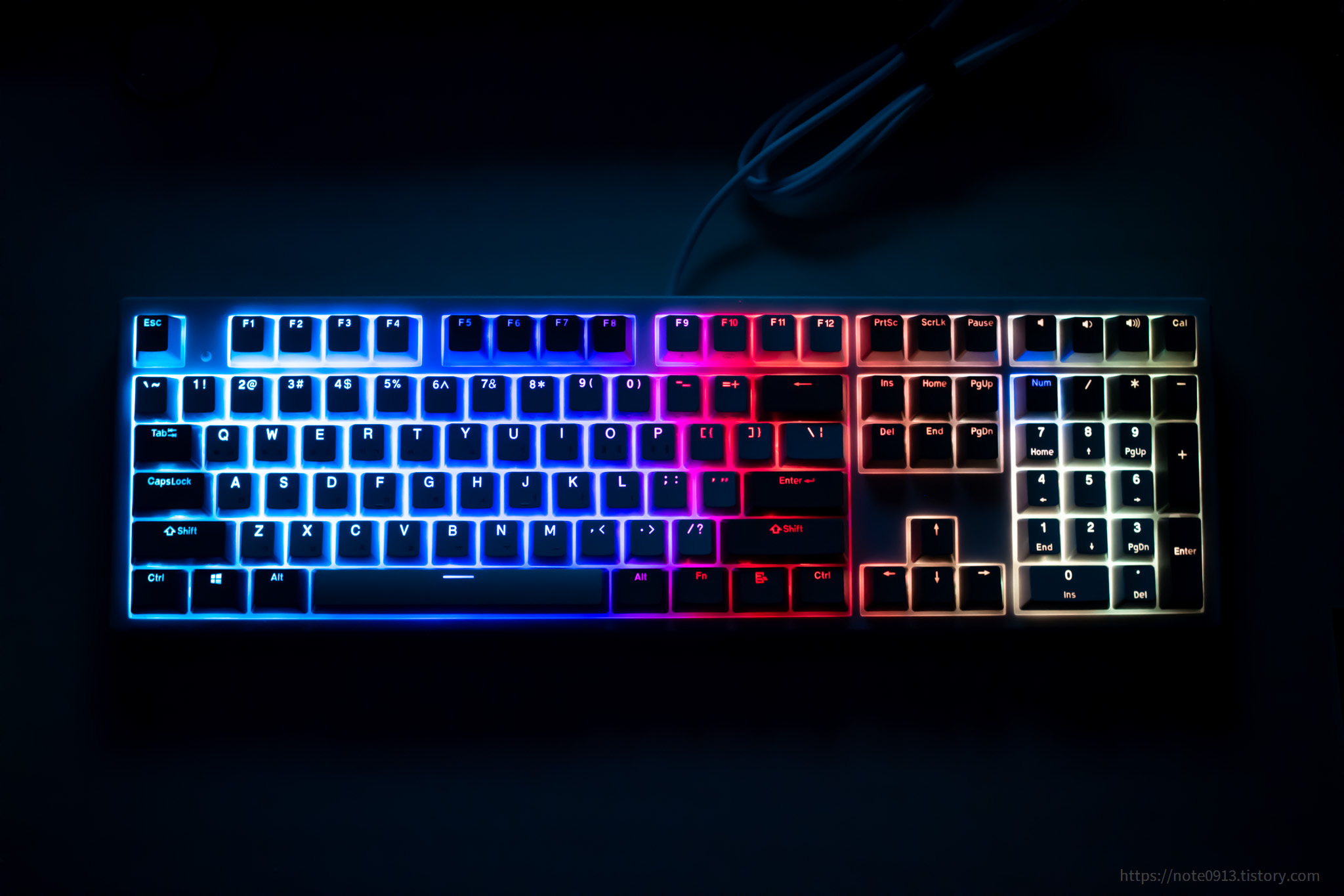 방에 불을 끄고 키보드를 보면 저런 모습입니다. 기본 키보드의 LED 색상은 좌측에 하늘색으로 시작해서 우측에 노란색으로 끝나는 그라데이션 형태의 LED 색상으로 나옵니다.