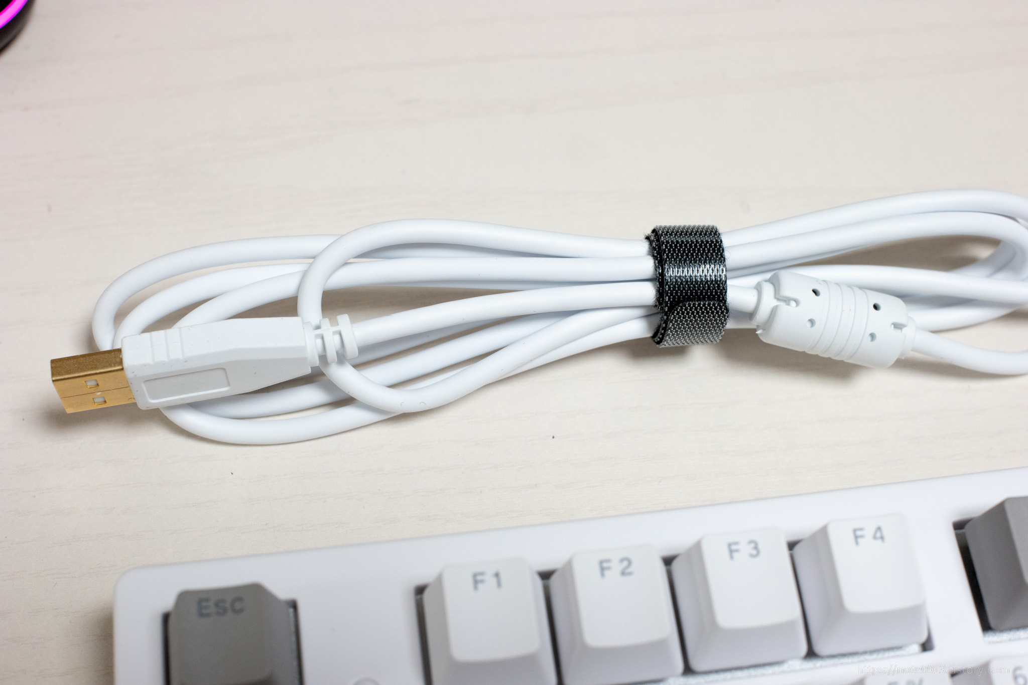 키보드 선입니다. 기본적으로 선정리용 벨크로 타이가 있고 단자 부분이 금도금으로 되어있습니다. 재질은 아쉽게도 고무 재질입니다. 케이블 만져보면 때가 엄청 잘 탈거 같은 느낌입니다. 하필 케이블 색상이 화이트이고 재질도 고무라서 때가 엄청 잘 탈거 같은데 여기는 조금 아쉽습니다.