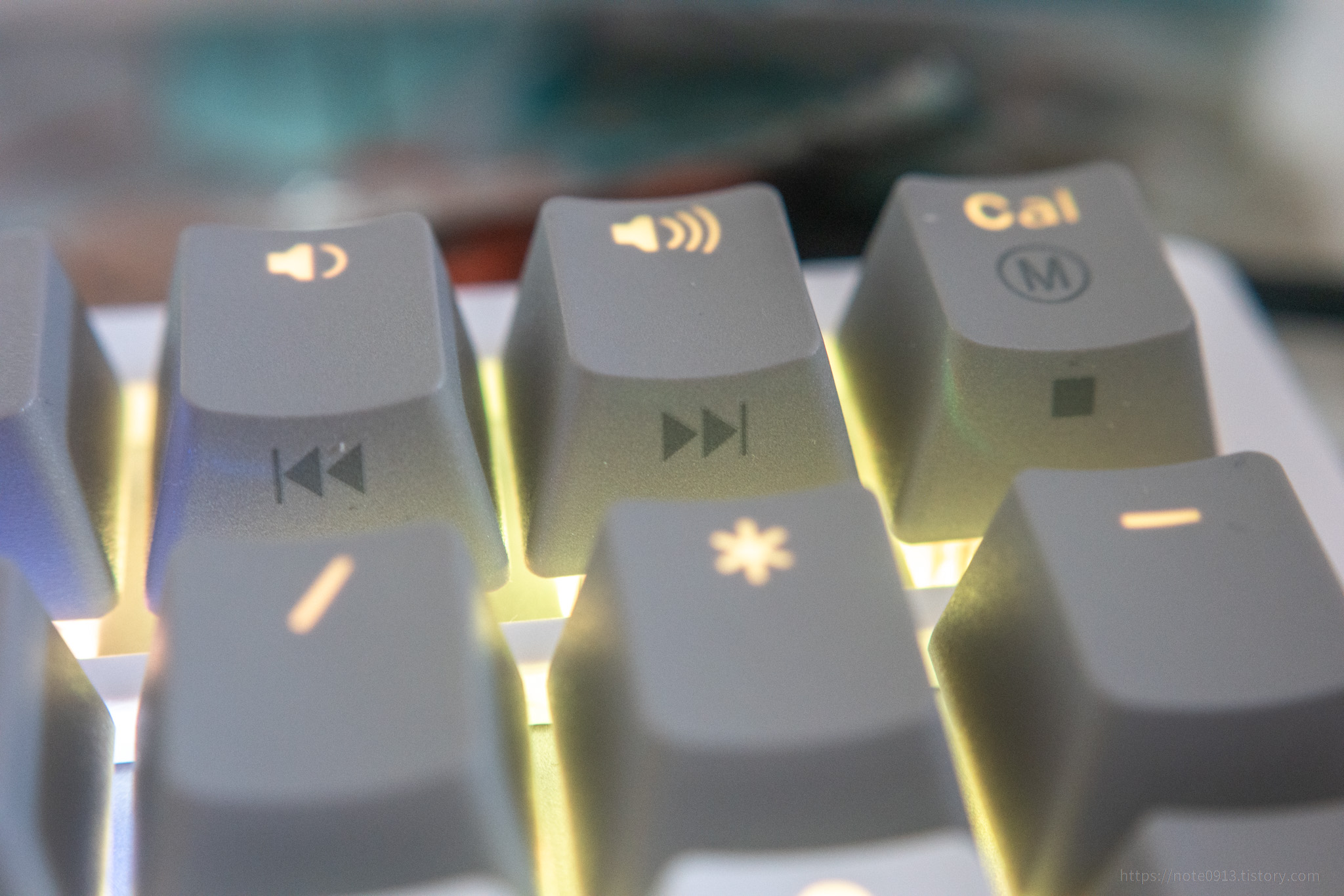 Cal 버튼의 실제 용도는 사용자 설정 키 모드입니다. 밑에 M이라고 적혀있는데 아무래도 Manual 또는 Macro의 약자인거 같습니다. Cal 글짜는 이중사출이 되어있어서 빛이 들어오는데 M은 각인이라서 빛이 안들어오는데 아무래도 초기 설계 때는 계산기 버튼과 사용자 설정 키 모드로 하려고 했는데 그러지 못했나 봅니다.
