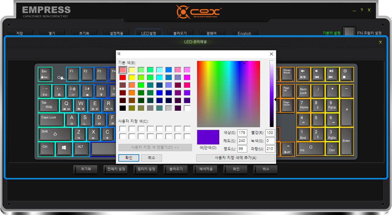 그 외에도 키보드 LED 색상도 사용자가 원하는 색상으로 지정할 수 있습니다. 여기서 키보드 색상을 지정하면 사용자 지정 색상인 FN + ` 에 저장됩니다.