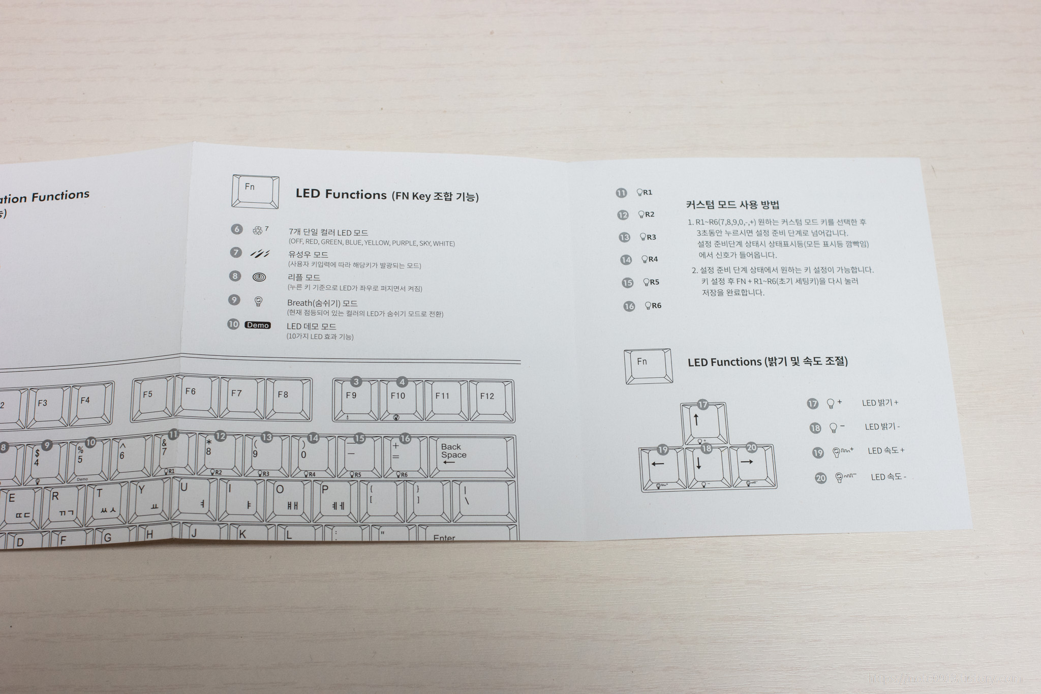 설명서입니다. 키보드 LED 사용법이랑 초기화 방법을 설명하고 있습니다. 키보드 초기화 방법은 Control(좌측) + ESC + Control(우측) + F12 를 5초동안 누르면 키보드가 초기화 됩니다.