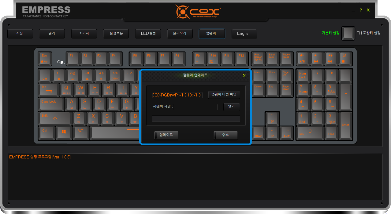 콕스에서 제공하는 프로그램을 실행하면 위와 같은 화면이 나옵니다. 키보드가 연결된 상태에서 상단에 있는 불러오기를 클릭하면 현재 설정된 키 값들을 불러옵니다.