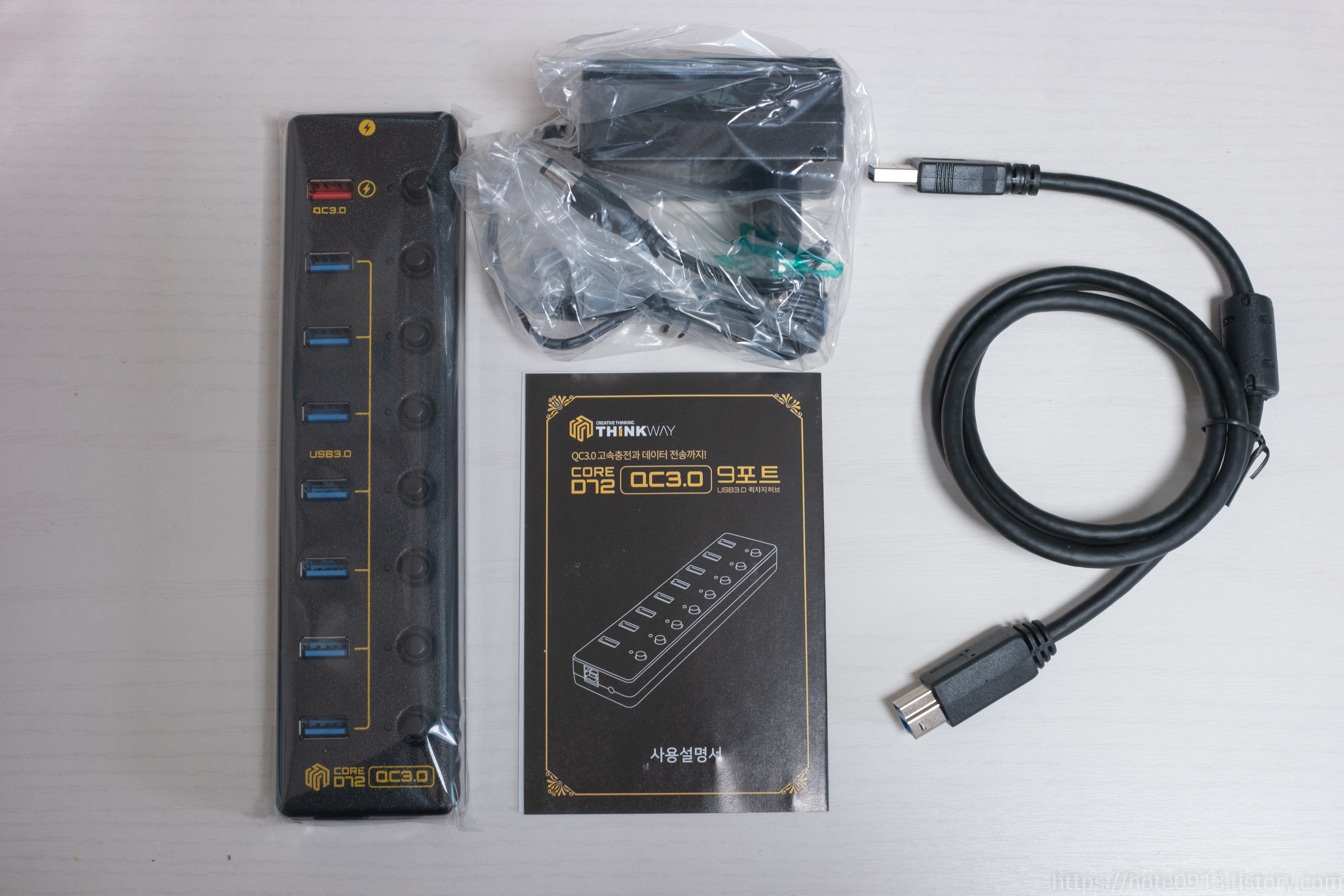 구성품은 USB 3.0 허브, 케이블, 전원 어댑터, 사용설명서로 구성되어 있습니다.