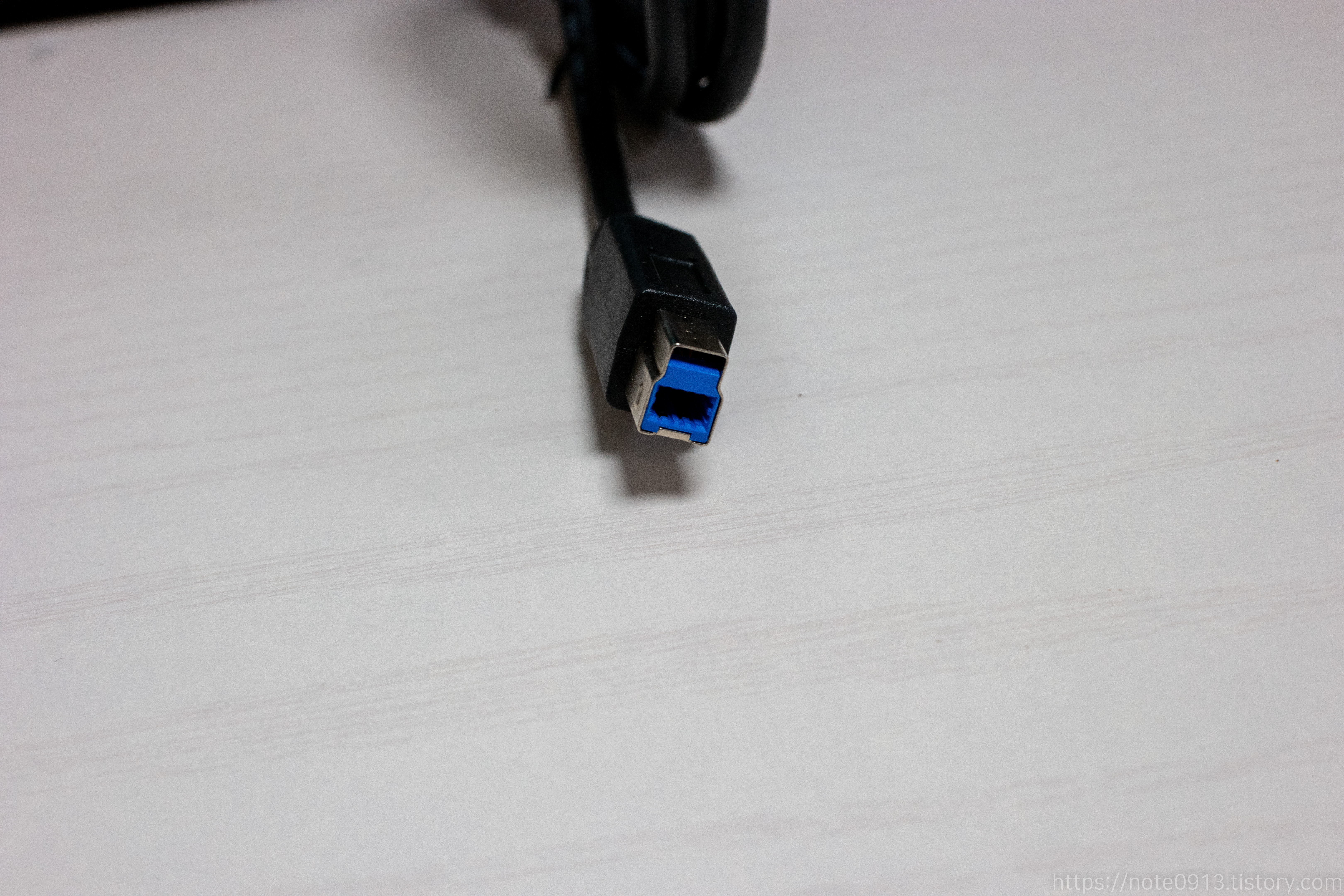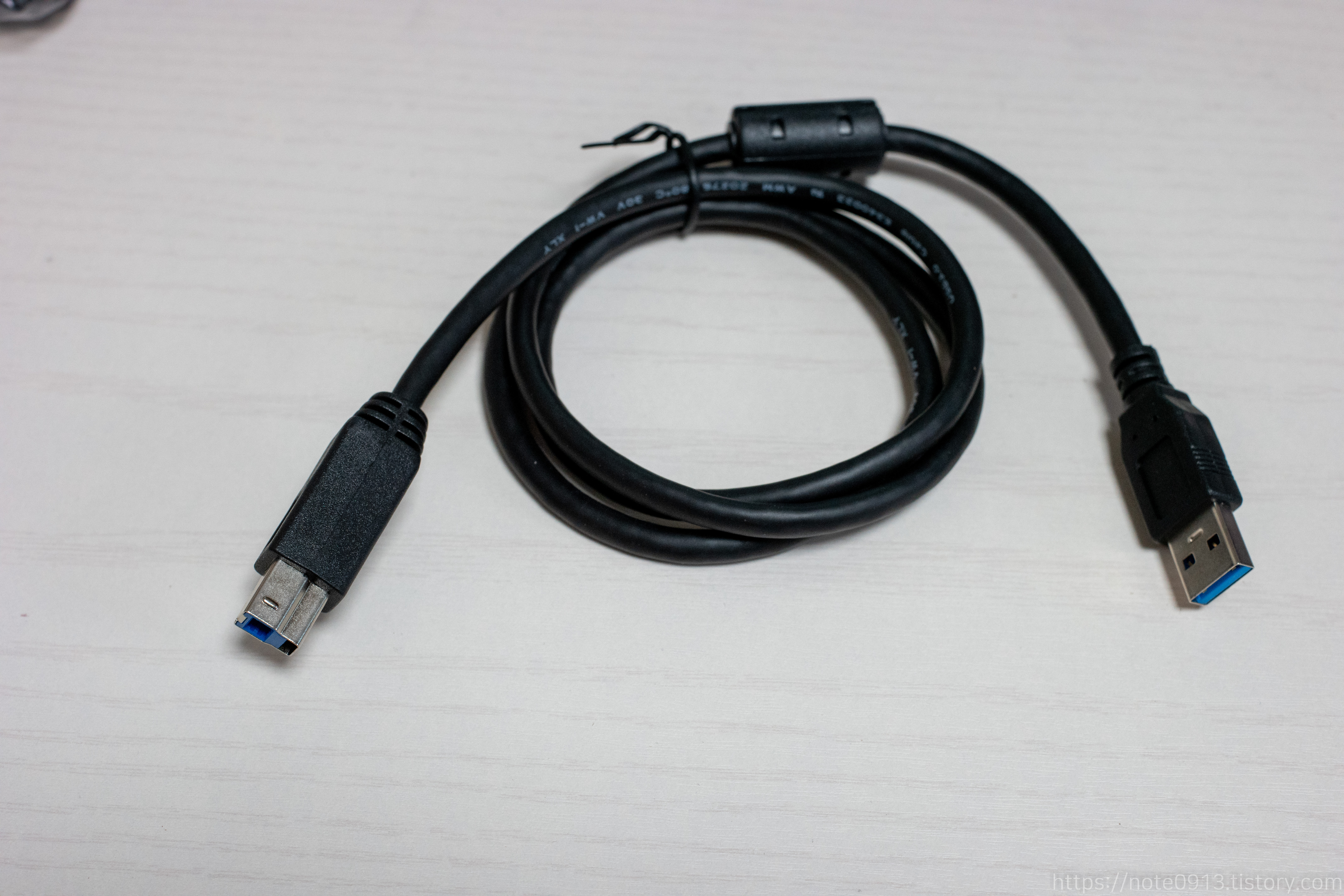 케이블은 USB 3.0 A to B 타입의 케이블입니다. 케이블은 두께가 꽤 두꺼워서 튼튼해 보입니다.