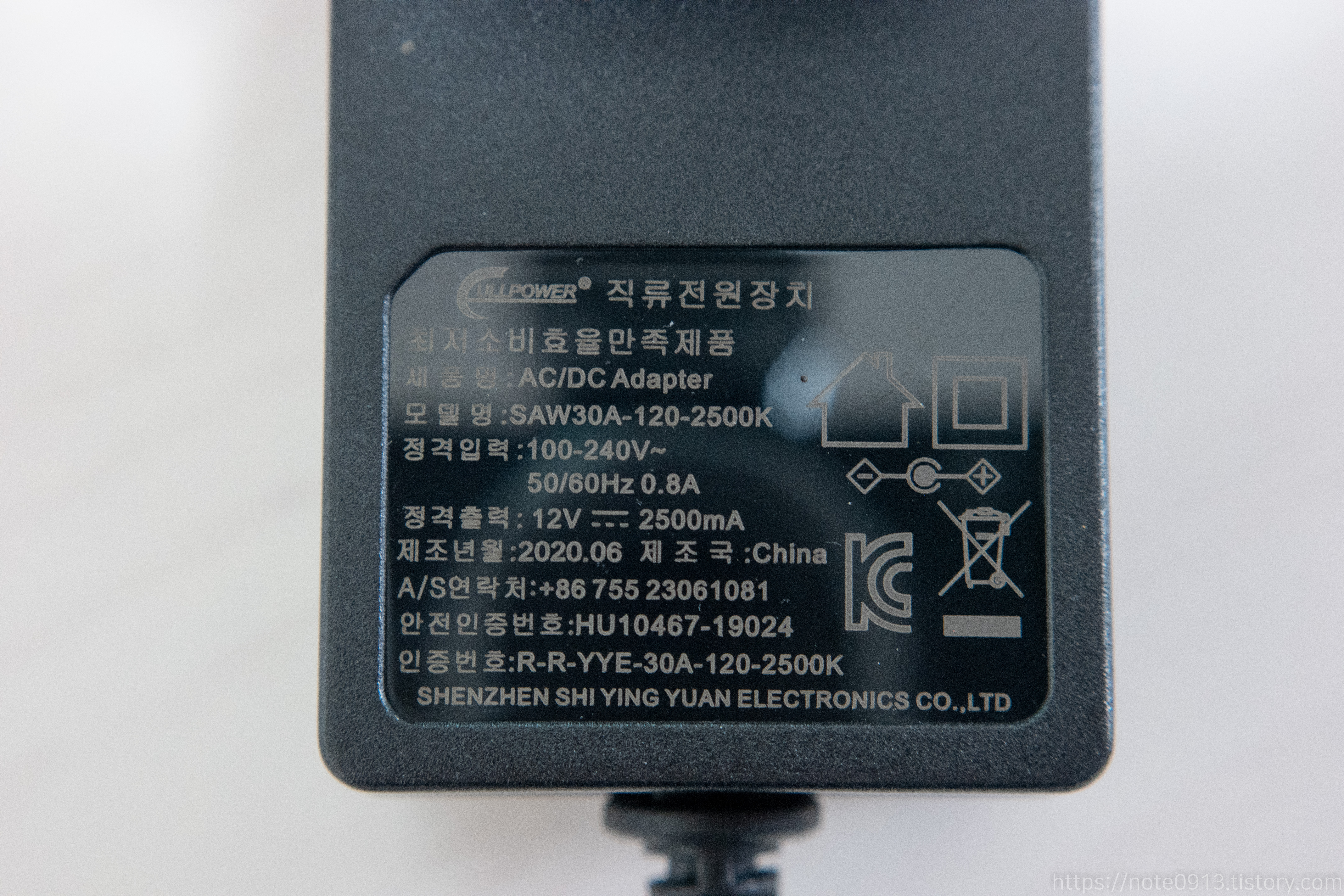 어댑터는 최대 12V 2.5A 까지 지원합니다. 30W 까지 출력을 감당할 수 있네요.
