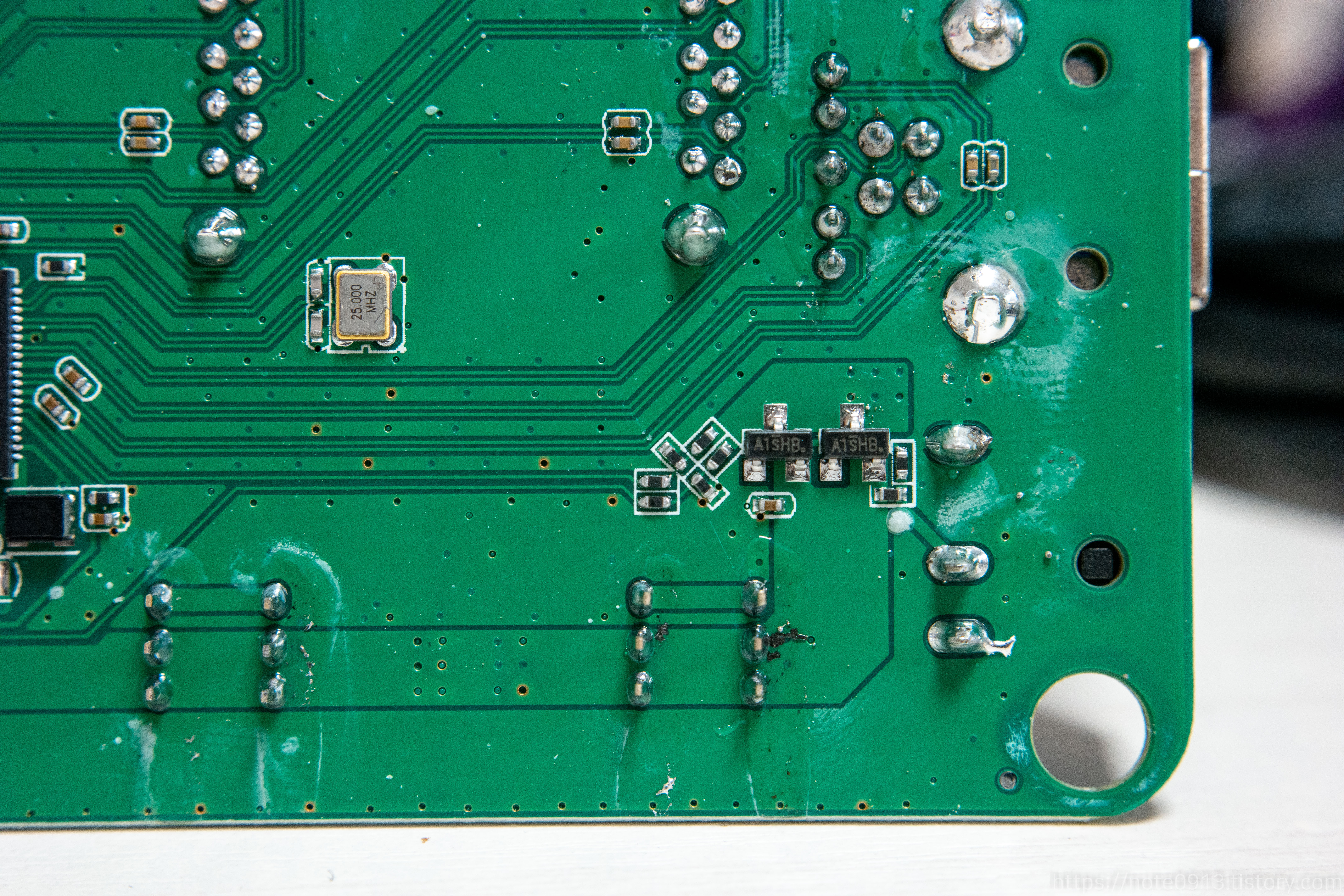 전원부쪽인데 P채널 MOSFET이 사용되었습니다. 기판 곳곳에 플럭스 자국이 조금씩 남아있습니다.