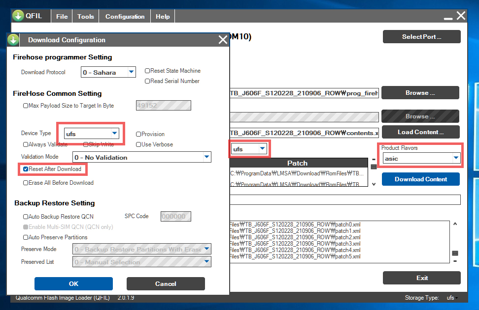 Download Configuration 에서 Device Type 에서 emmc 에서 ufs 로 변경합니다. 그리고 밑에 Reset After Download 를 체크합니다.