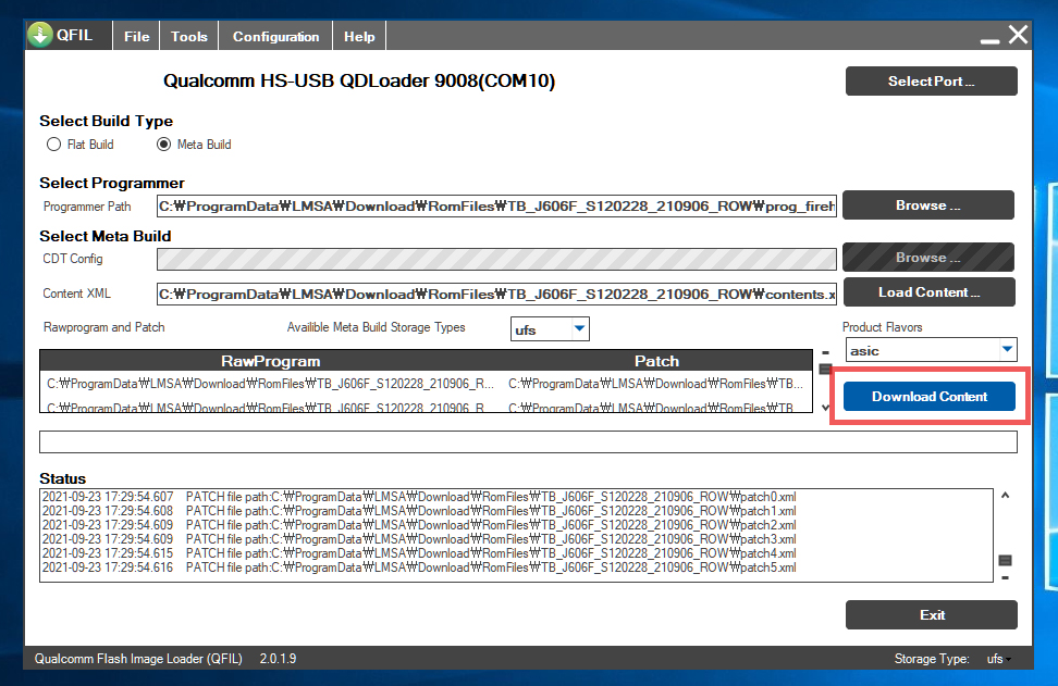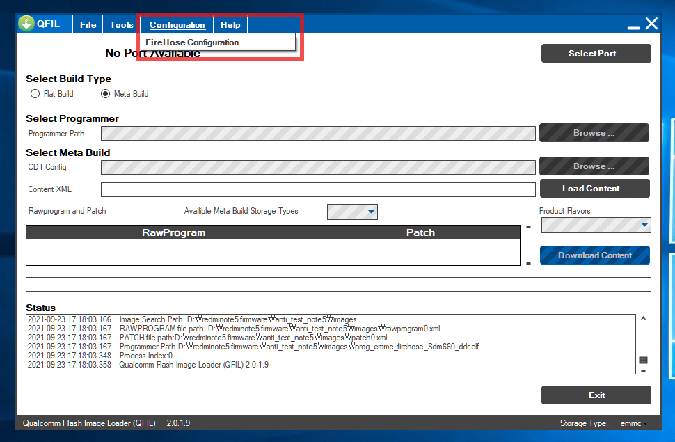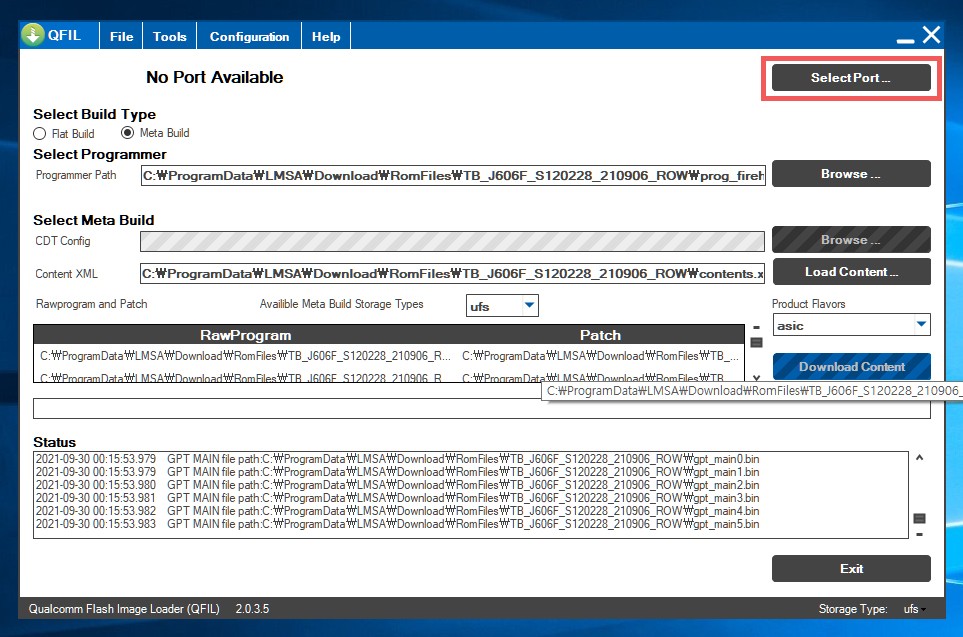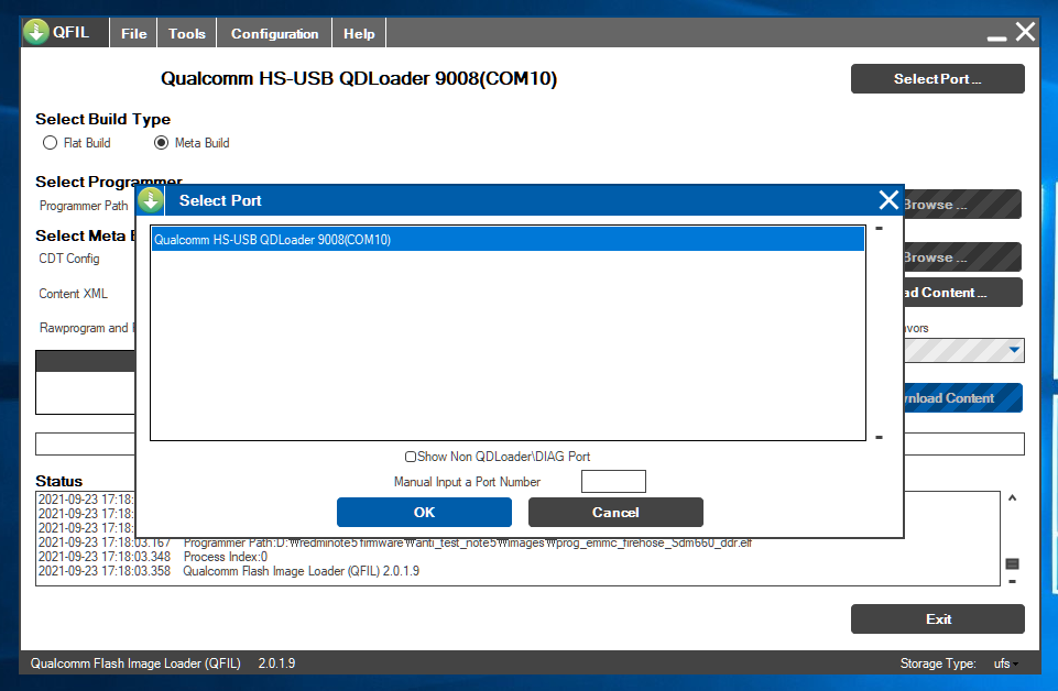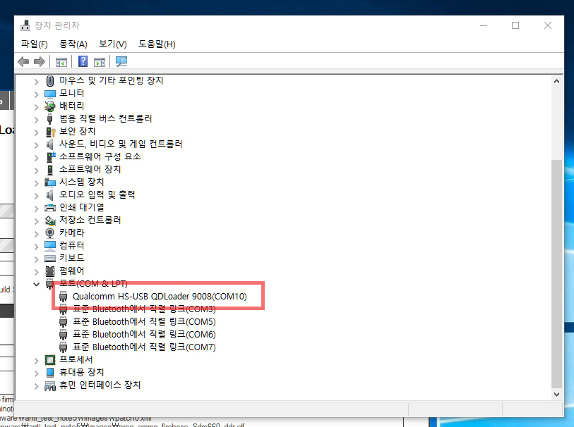 Qualcomm HS-USB QDLoader 9008 가 연결된 포트를 선택합니다.