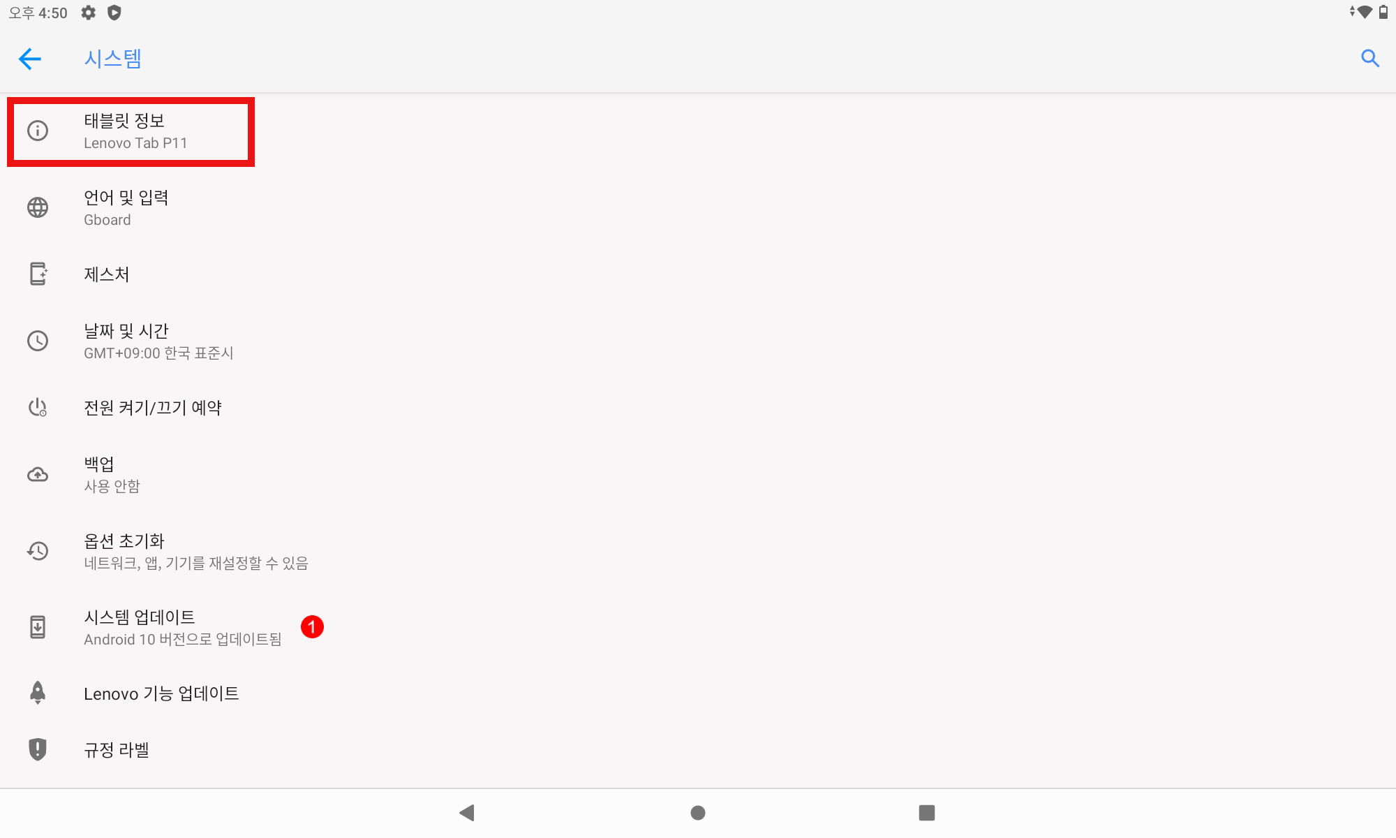글로벌 롬 기준으로 설정 - 시스템에 들어가면 태블릿 정보가 있습니다. 테블릿 정보를 터치합니다.