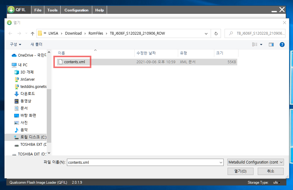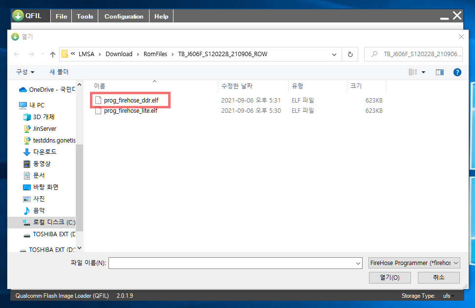롬을 다운로드한 폴더로 들어가서 prog_firehose_ddr.elf 파일을 선택합니다.