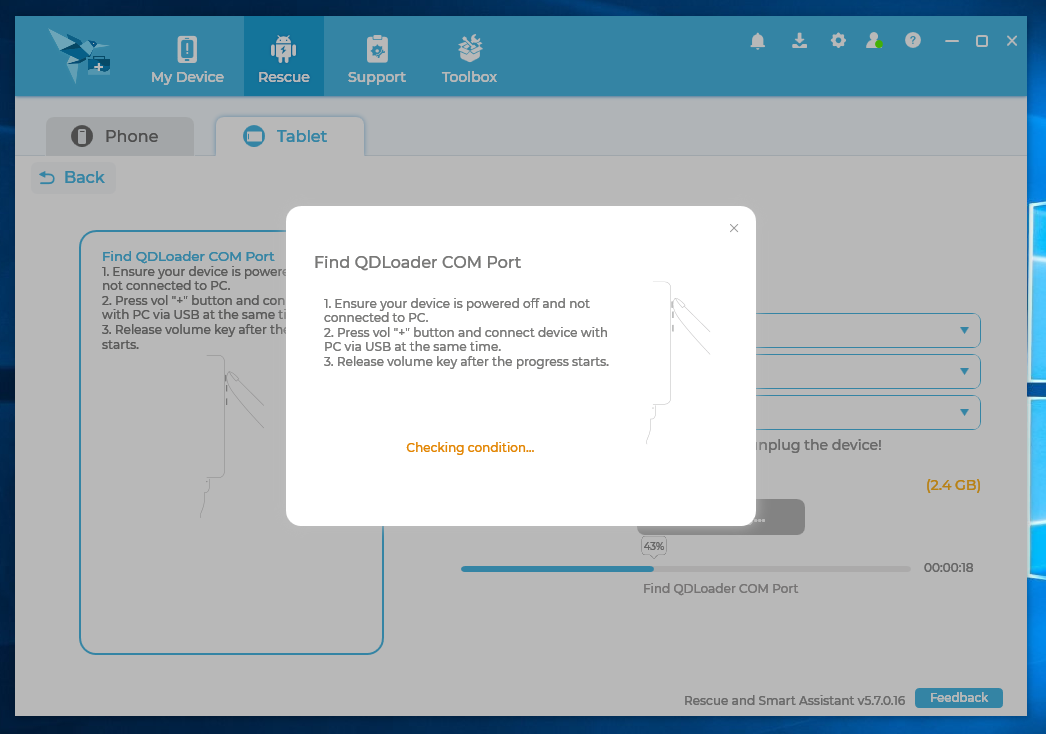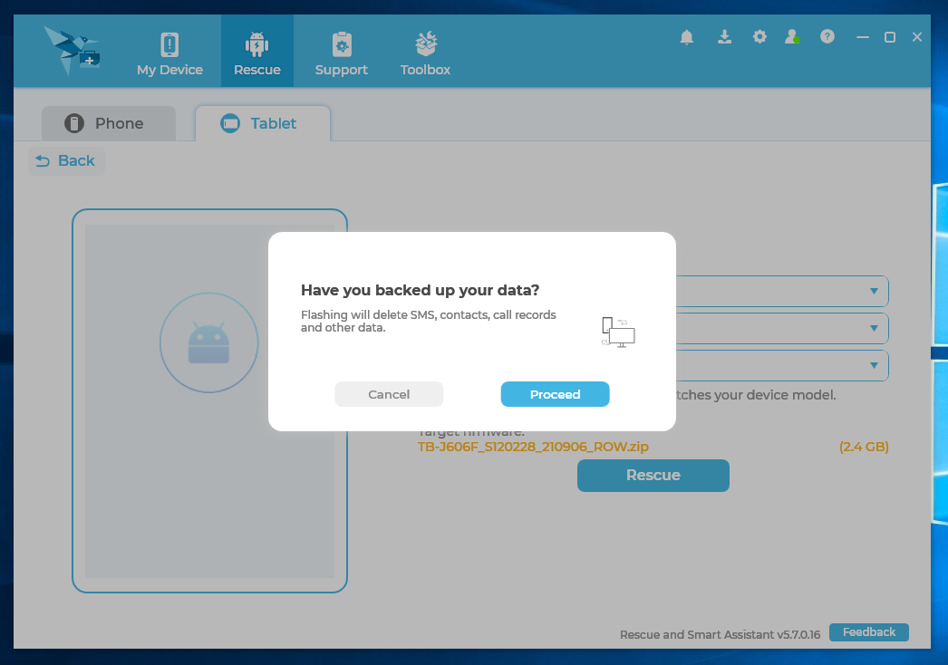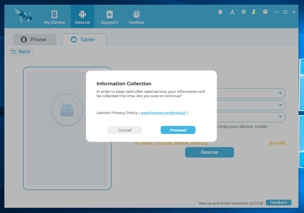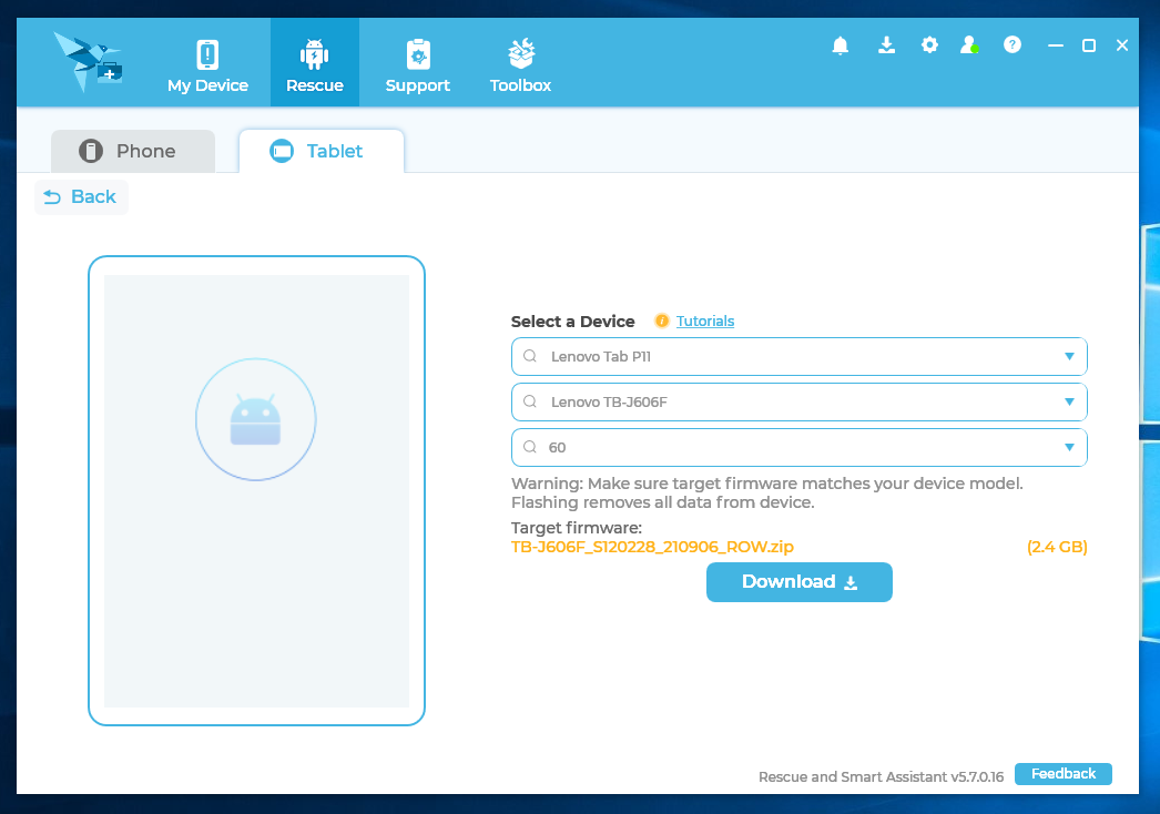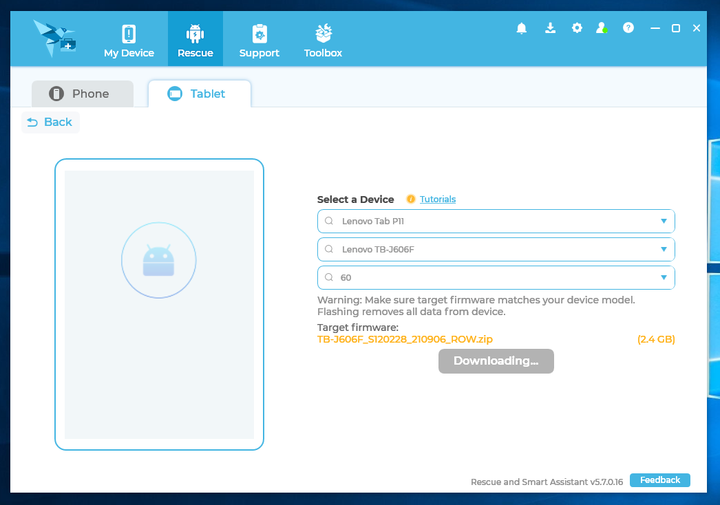 그러나 현재 내수용 롬(중국롬)이 설치되어 있다면 Rescue and Smart Assistant 에서 자동으로 롬을 선택하므로 내수용 롬에서 글로벌 롬으로 설치하려면 먼저 P11 태블릿을 연결하지 않고 Rescue and Smart Assistant를 실행해야 합니다.