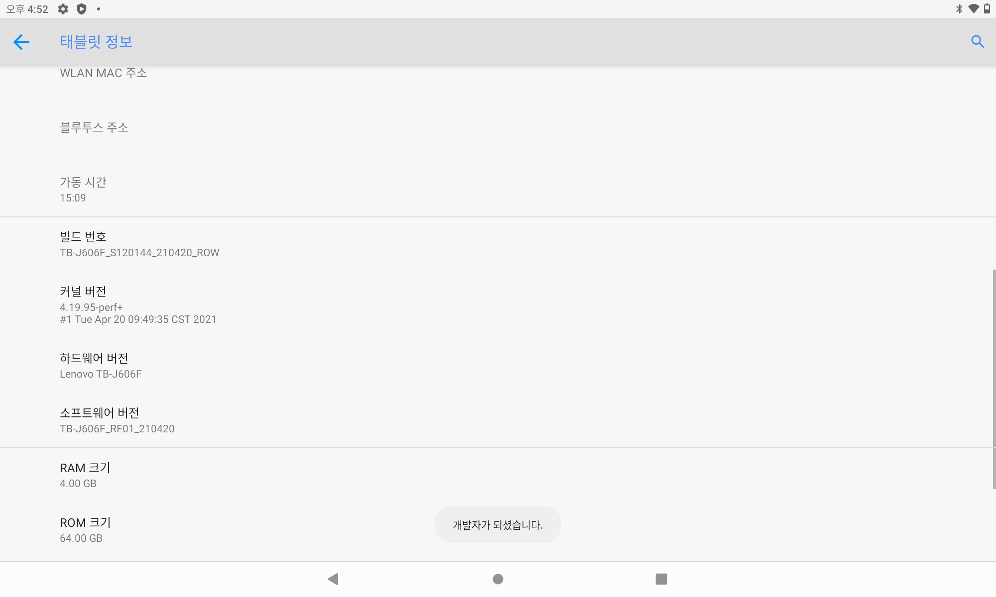 태블릿 정보에서 밑으로 내려보면 빌드 번호가 있습니다. 빌드번호를 여러번 터치하면 개발자 모드가 활성화 됩니다.