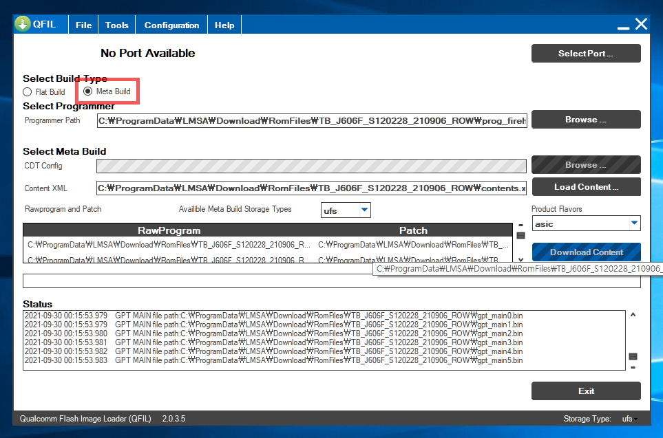 Available Meta Build Storage Type 에서 ufs 선택, Product Flavors 에서 asic 을 선택합니다.