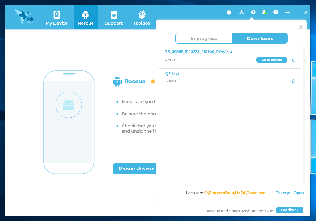 다운로드를 완료하면 Rescue 버튼이 활성화 됩니다. Rescue 버튼을 누르면 롬 설치를 시작합니다.