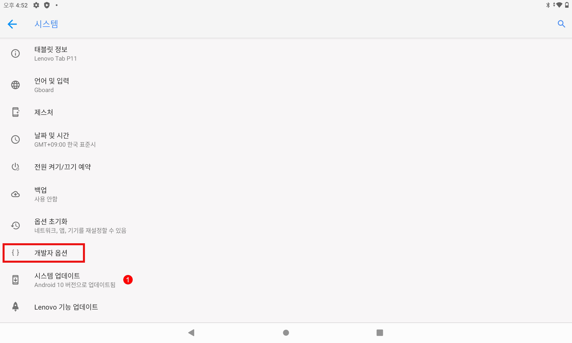 이제 설정 - 시스템에 들어가면 개발자 옵션이라는 항목이 새로 생기게 됩니다. 개발자 옵션을 터치해서 들어가 줍니다.