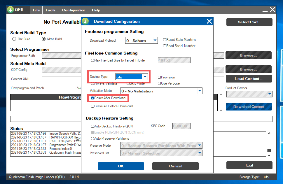 Download Configuration 에서 Device Type 에서 emmc 에서 ufs 로 변경합니다. 그리고 밑에 Reset After Download 를 체크합니다.