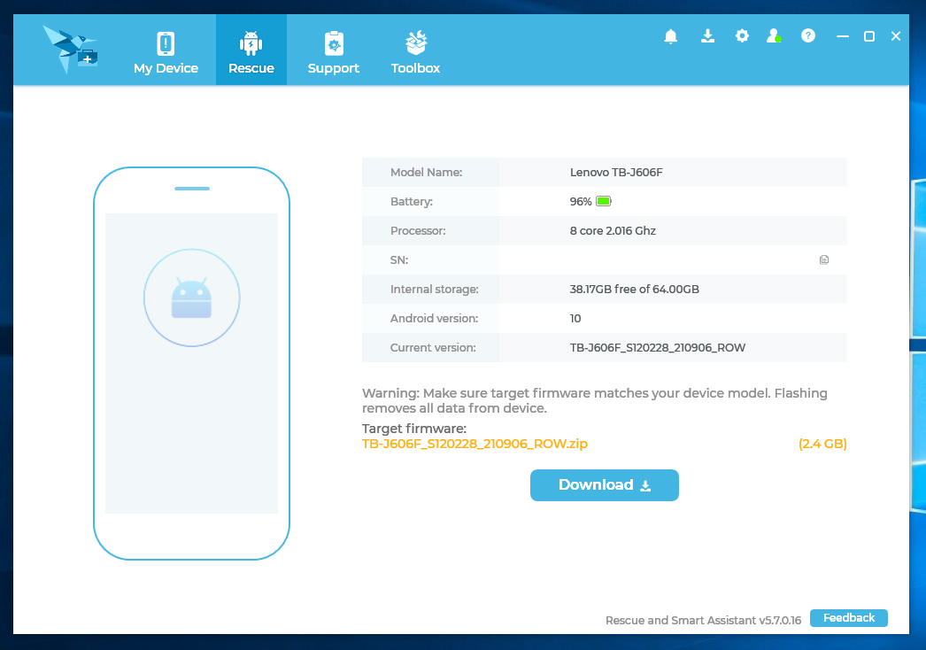 글로벌 롬이 설치되어있다면 Lemovo Rescue and Smart Assistant 를 설치하고 P11을 USB 디버깅으로 연결한 후 Rescue 메뉴를 선택하면 위와 같은 화면이 나옵니다. Dwonload를 누르면 최신 롬을 다운로드 받습니다.