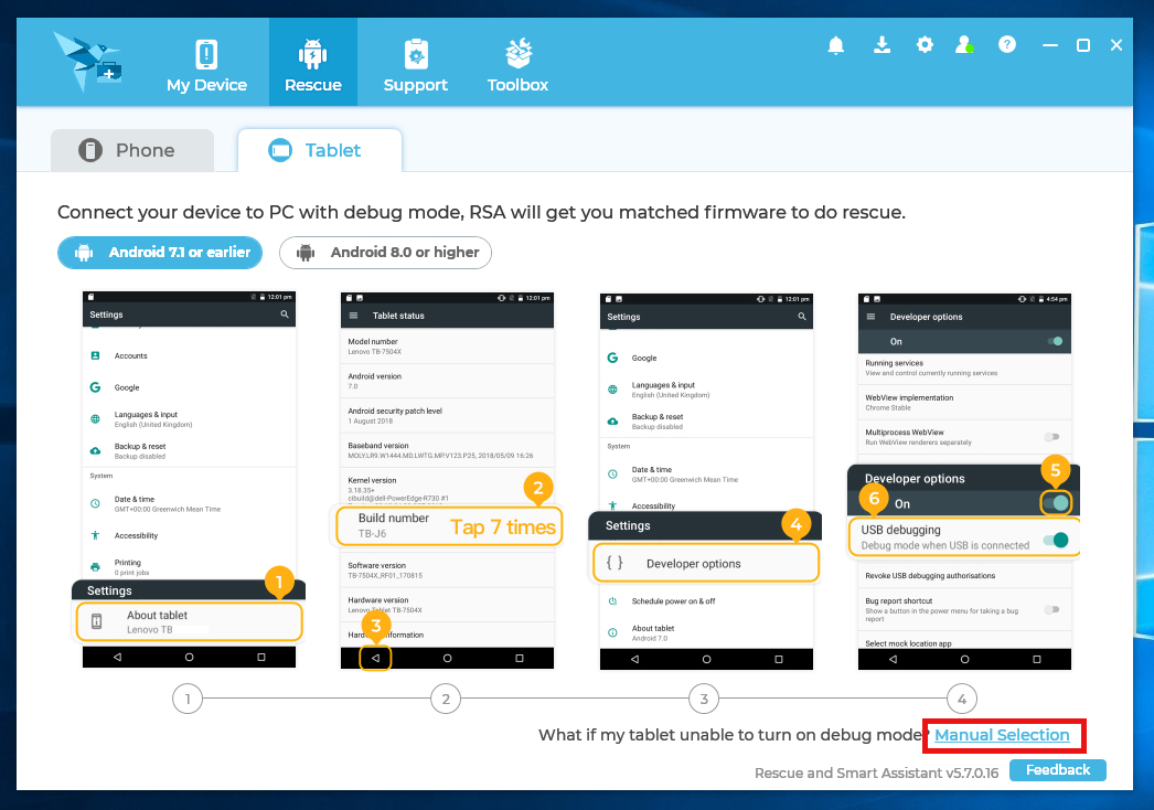 P11 을 연결하지 않은 상태에서 Rescue - Tablet 메뉴에서 우측하단에 보면 Manual Selection 이라는 옵션이 나타납니다. Manual Selection을 클릭해 줍니다.