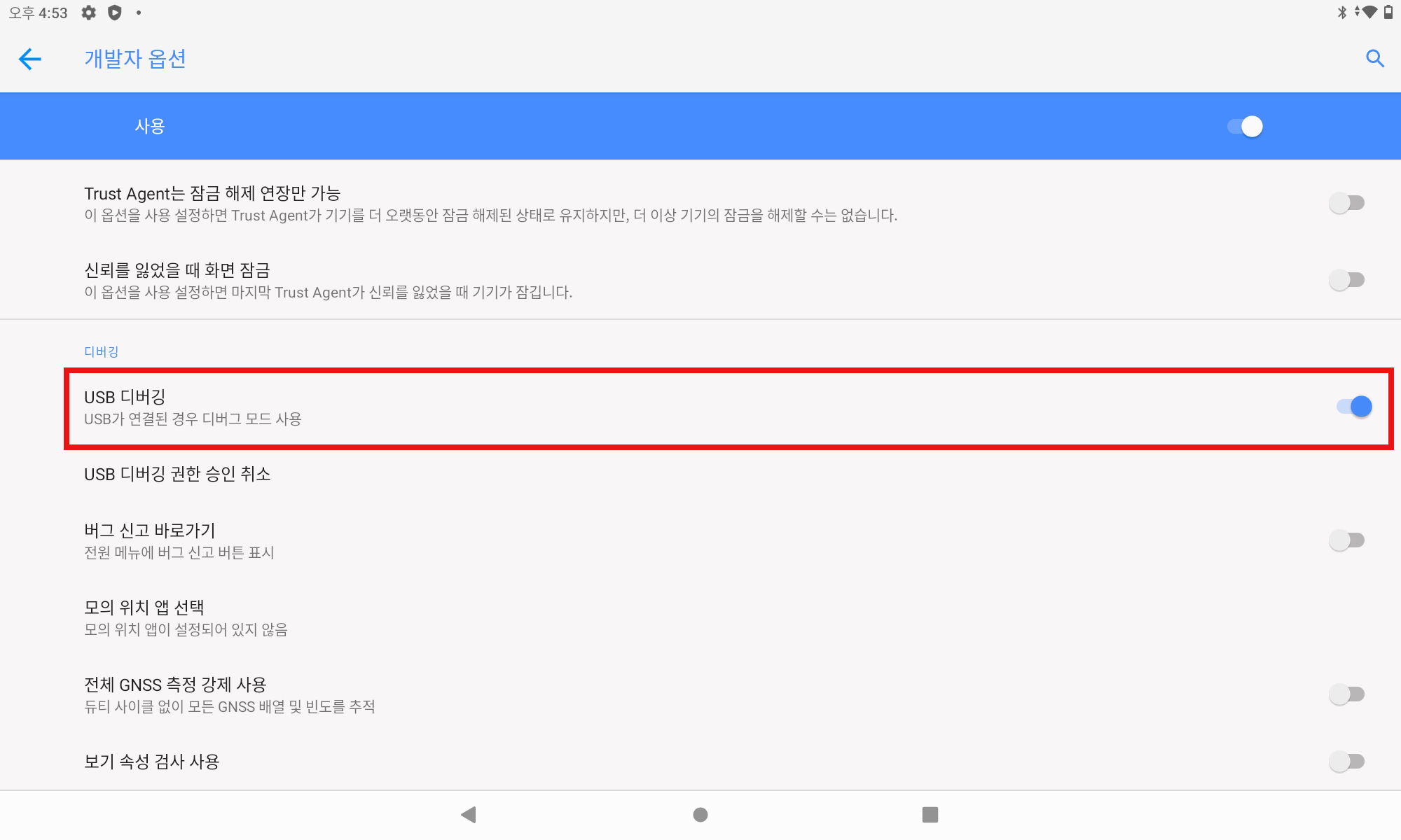 개발자 옵션에서 USB 디버깅을 터치해서 활성화해줍니다. 활성화 하려면 안내 팝업이뜨는데 허용을 눌러주면 활성화 됩니다.