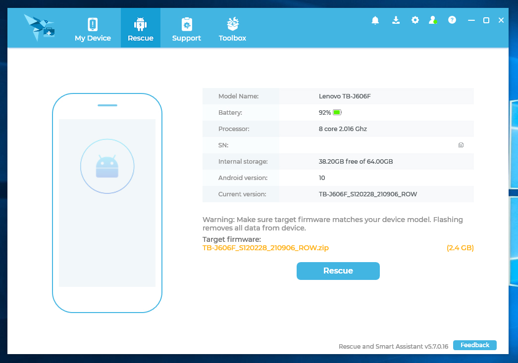 다운로드를 완료하면 Rescue 버튼이 활성화 됩니다. Rescue 버튼을 누르면 롬 설치를 시작합니다.