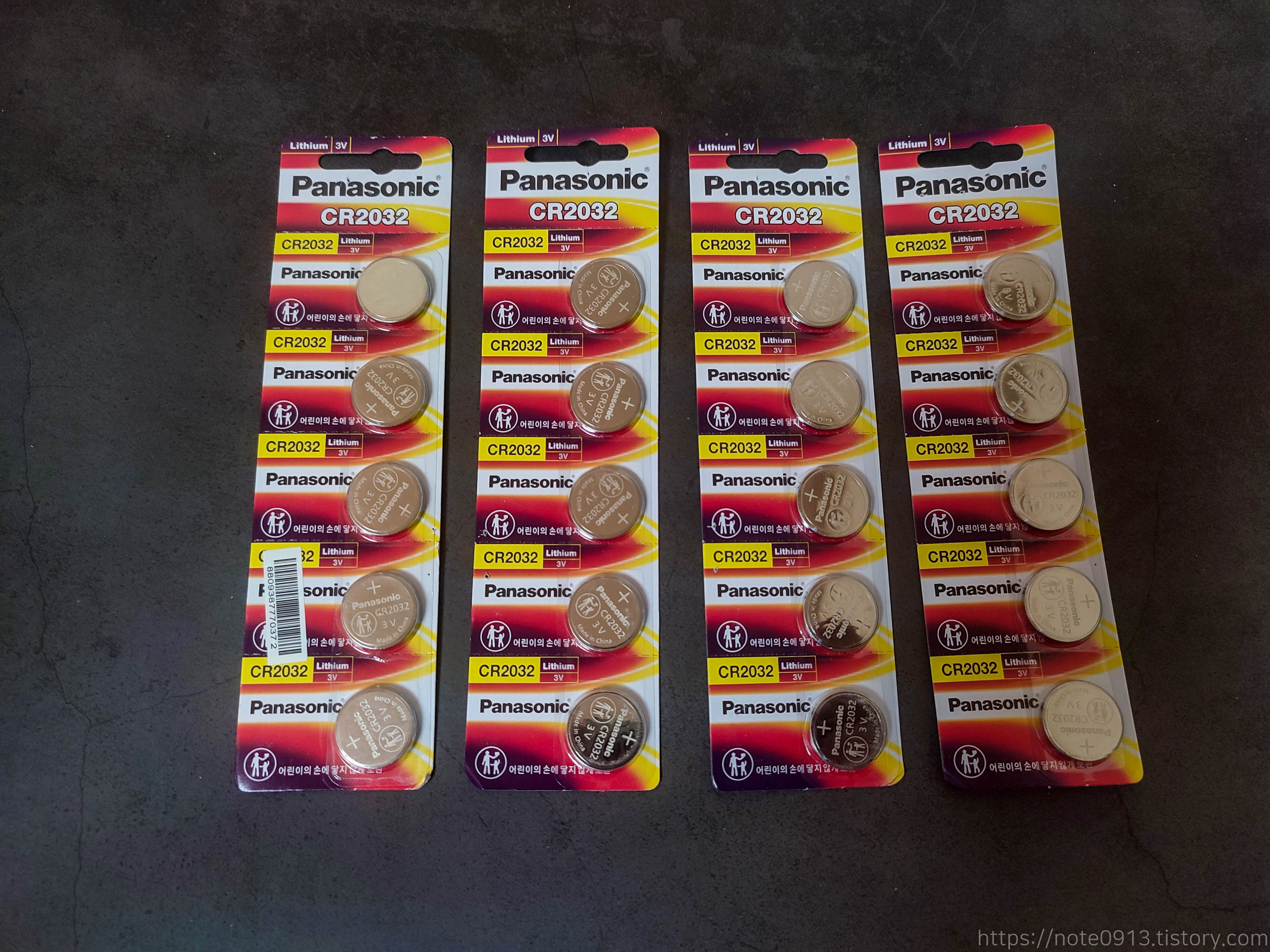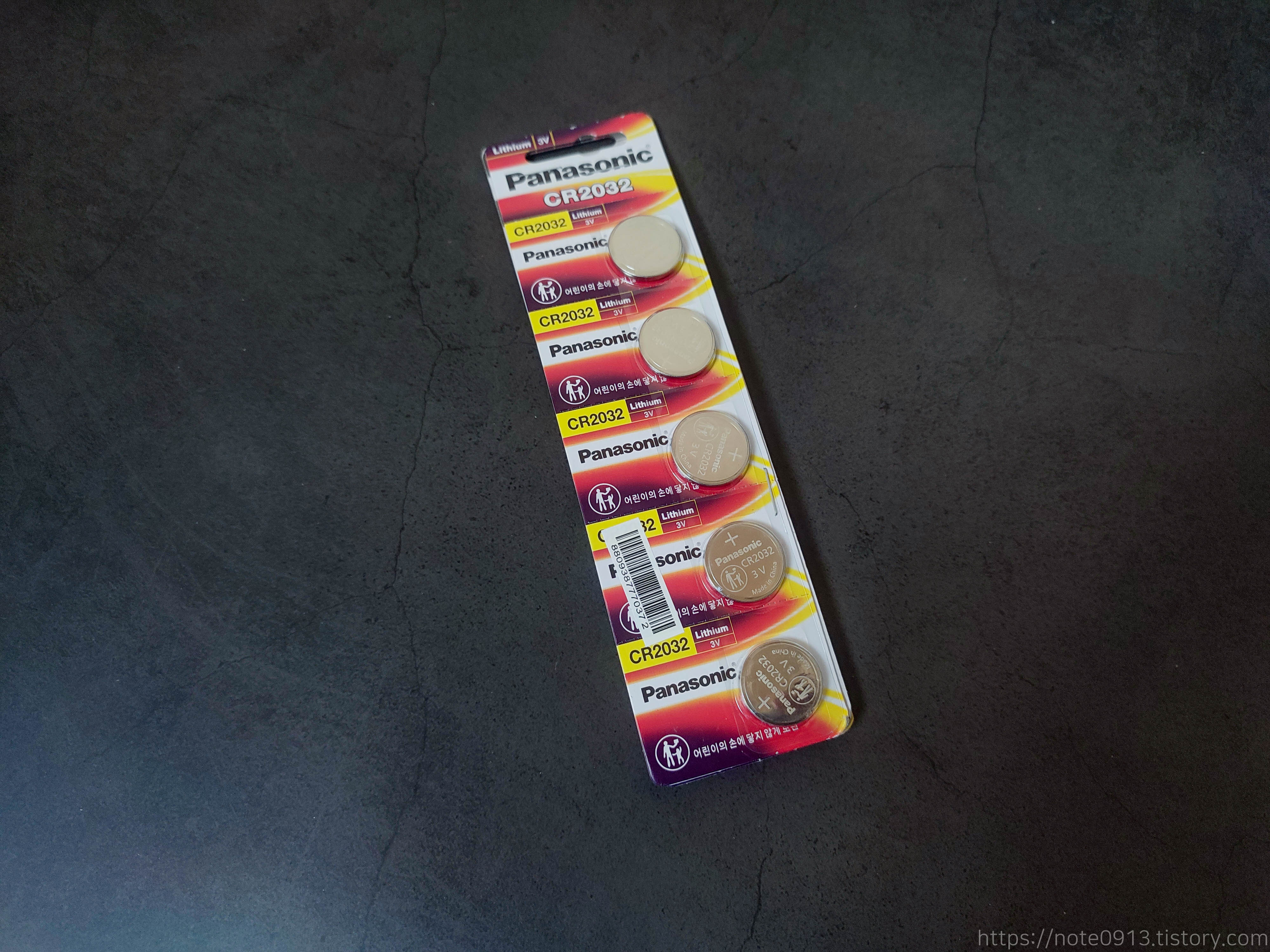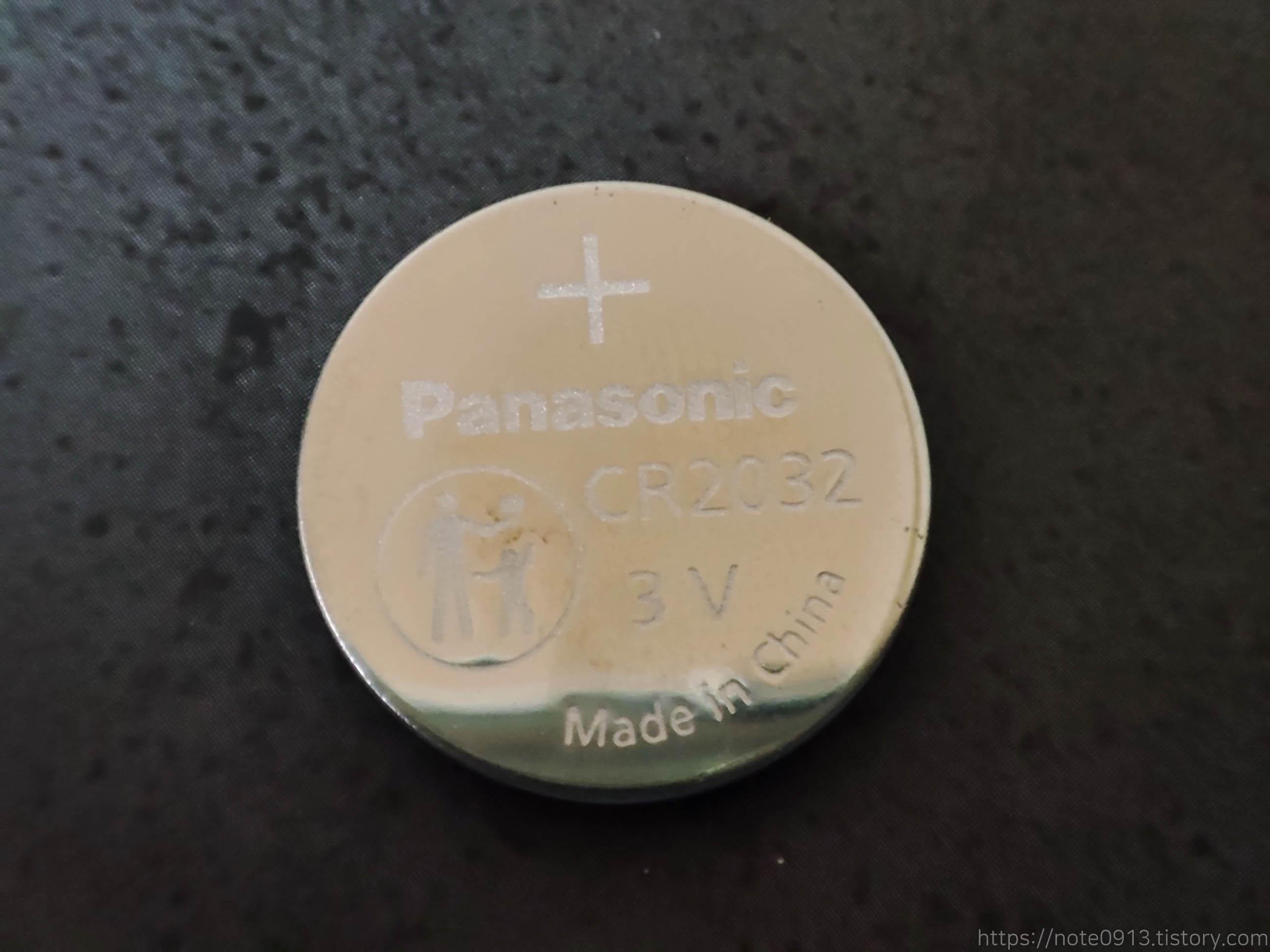 파나소닉 CR2032 배터리 입니다. 흔히 코인전지, 버튼전지, 수은전지 등등 다양한 이름으로 불리는데 과거에는 수은을 재료로 썼었지만 요즘에는 환경과 안체 문제로 수은을 쓰지 않는다고 합니다.