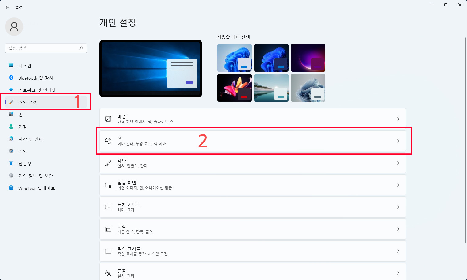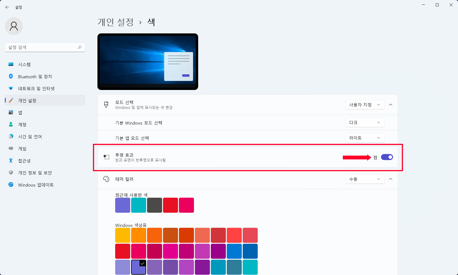 색 설정에서 투명 효과를 켬 상태에서 꺼짐 상태로 변경해 줍니다.