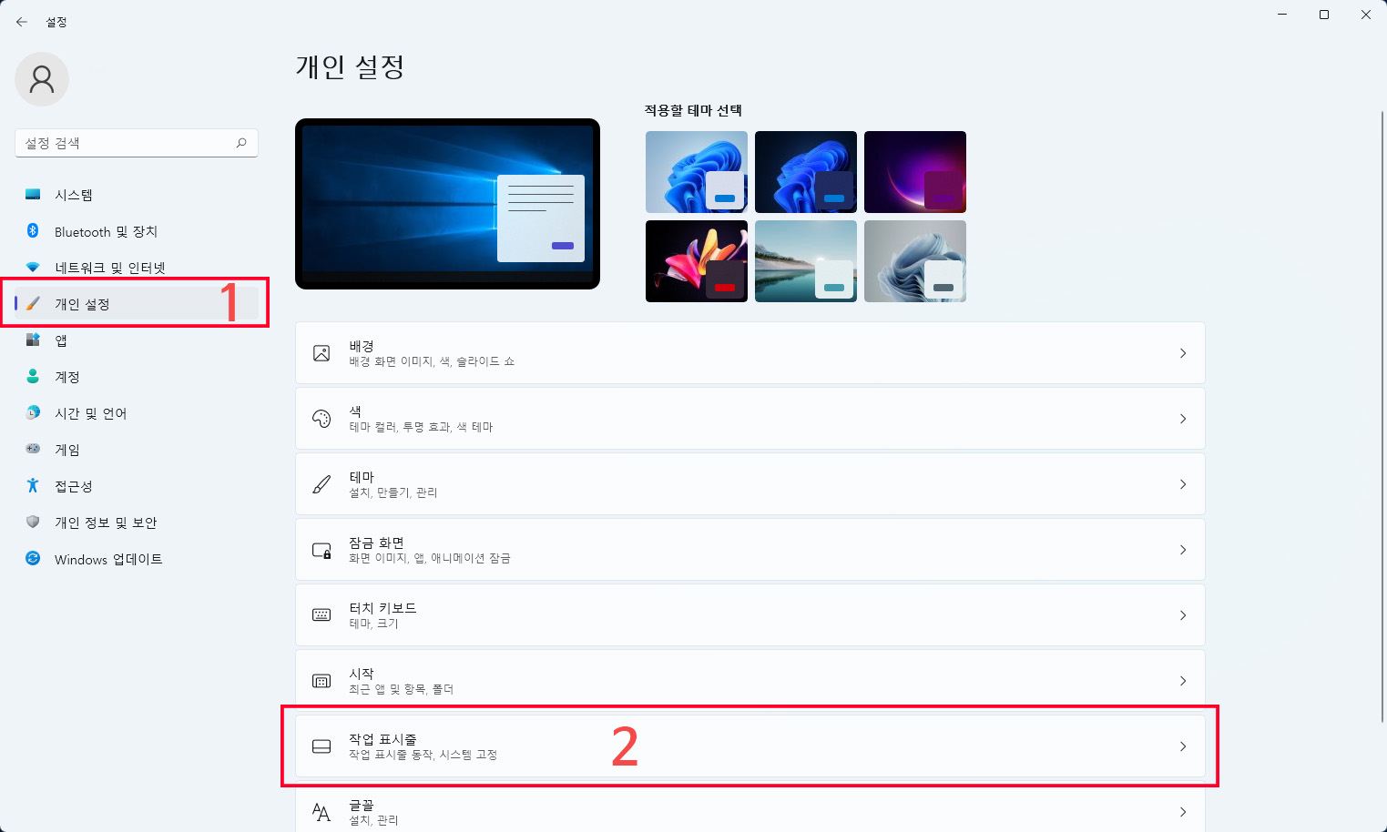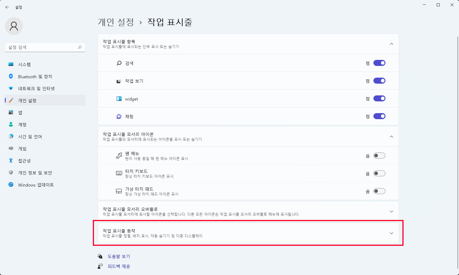 우선 윈도우11의 설정 앱을 열어 개인 설정 - 작업 표시줄 항목을 클릭해 줍니다.