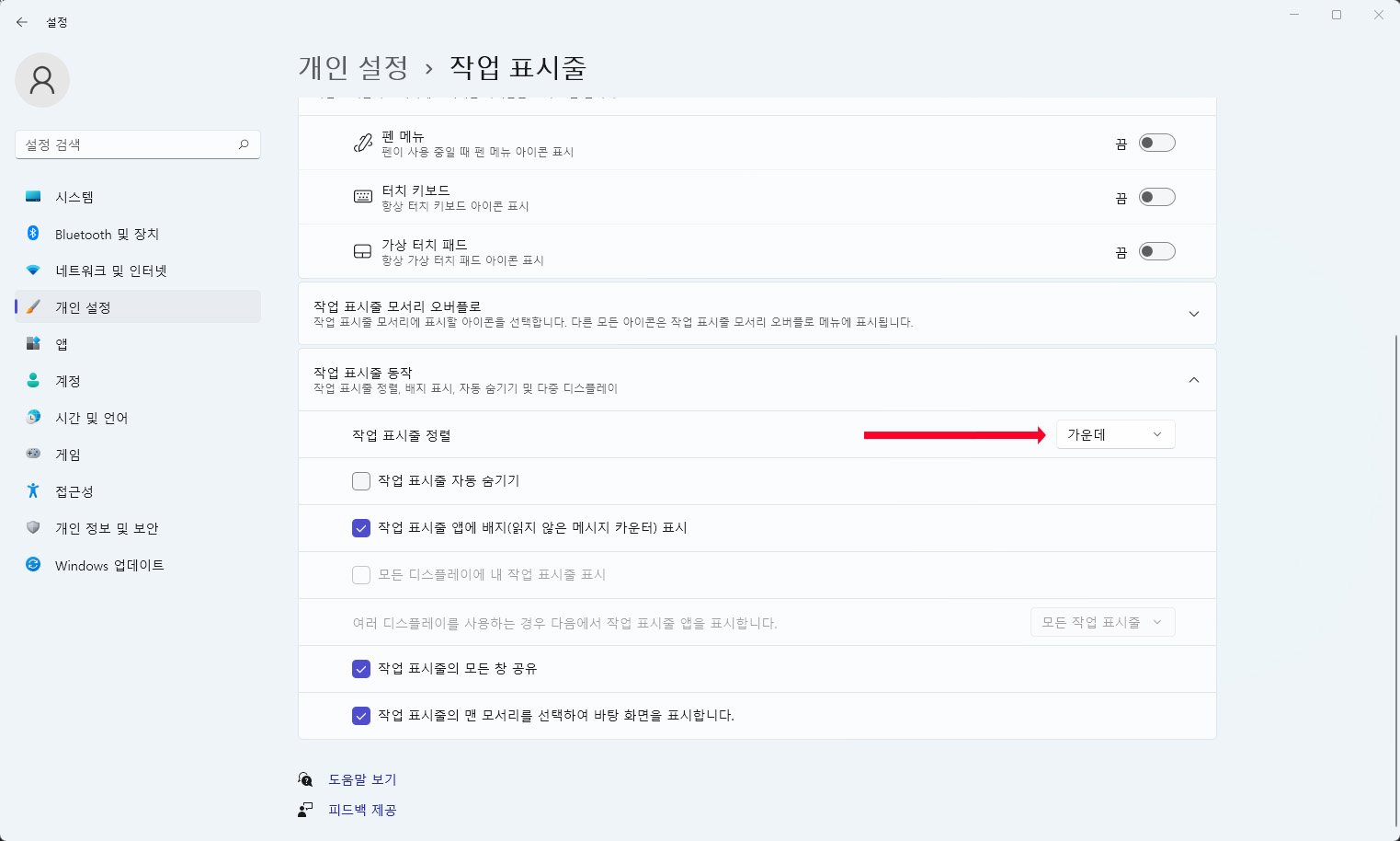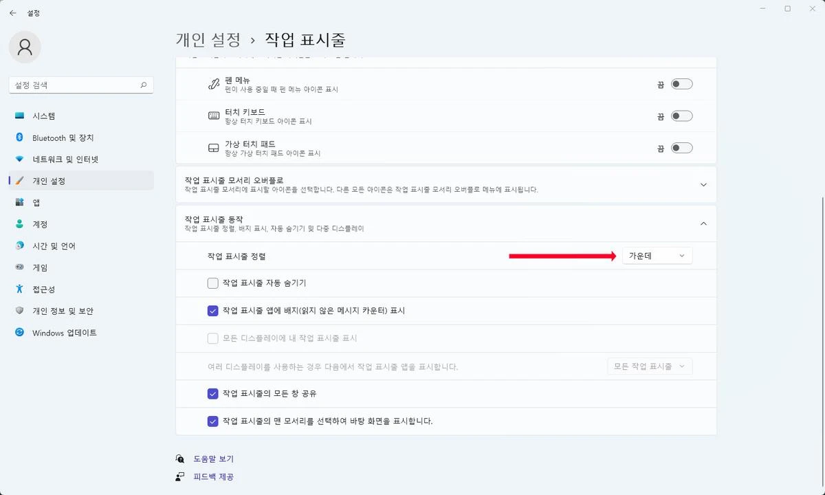 작업 표시줄 정렬 메뉴를 보면 가운데로 설정되어 있습니다. 클릭하여 가운데를 왼쪽으로 설정해 줍니다.