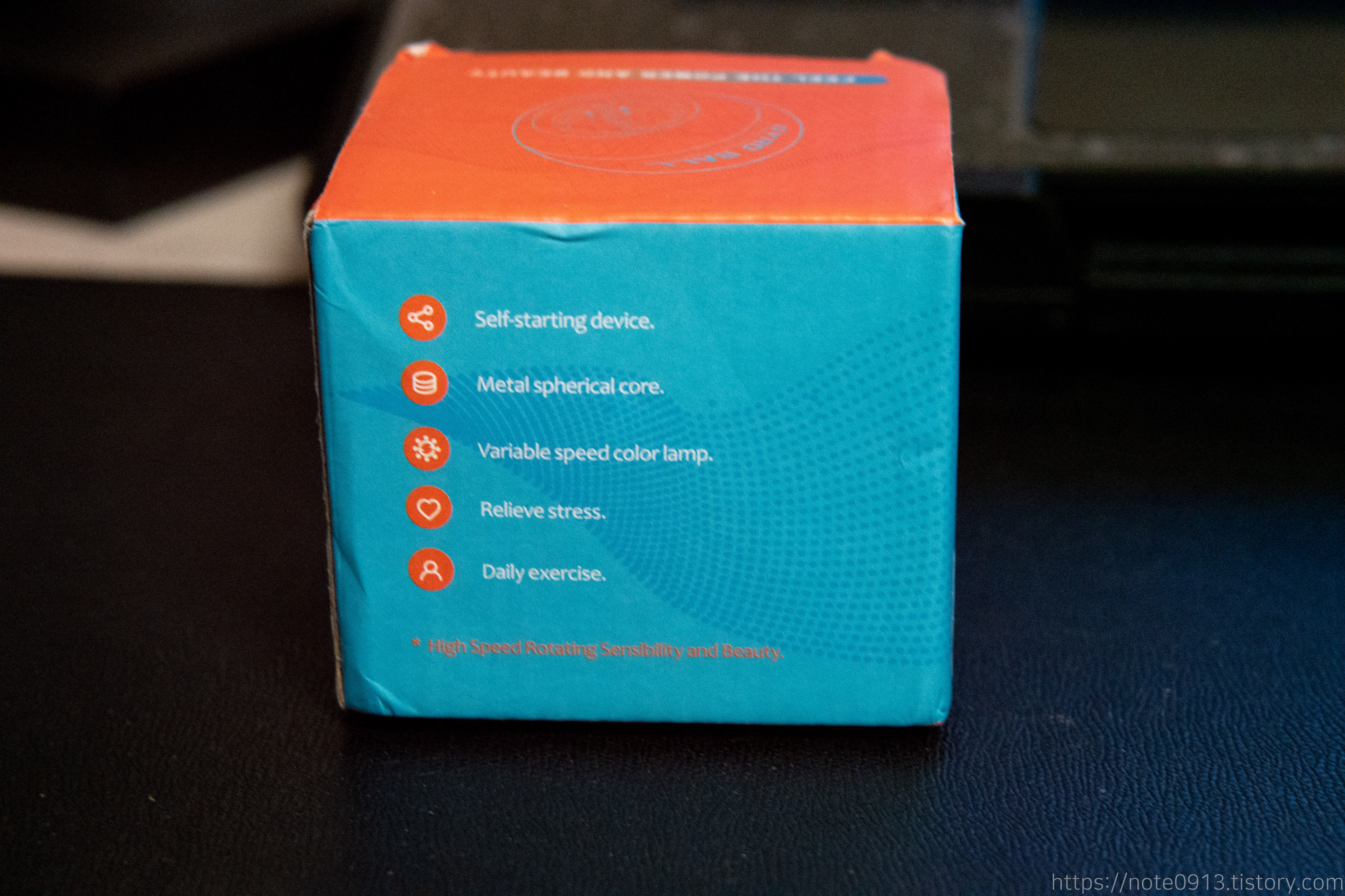 윗부분에는 회전부가 노출되어 있습니다. 저기 화살표 방향대로 공을 돌렸다가 놓으면 반대방향으로 회전합니다. 마치 자동차 장난감처럼 뒤로 당겼다고 놓으면 앞으로 나가는 거랑 같은 원리입니다.