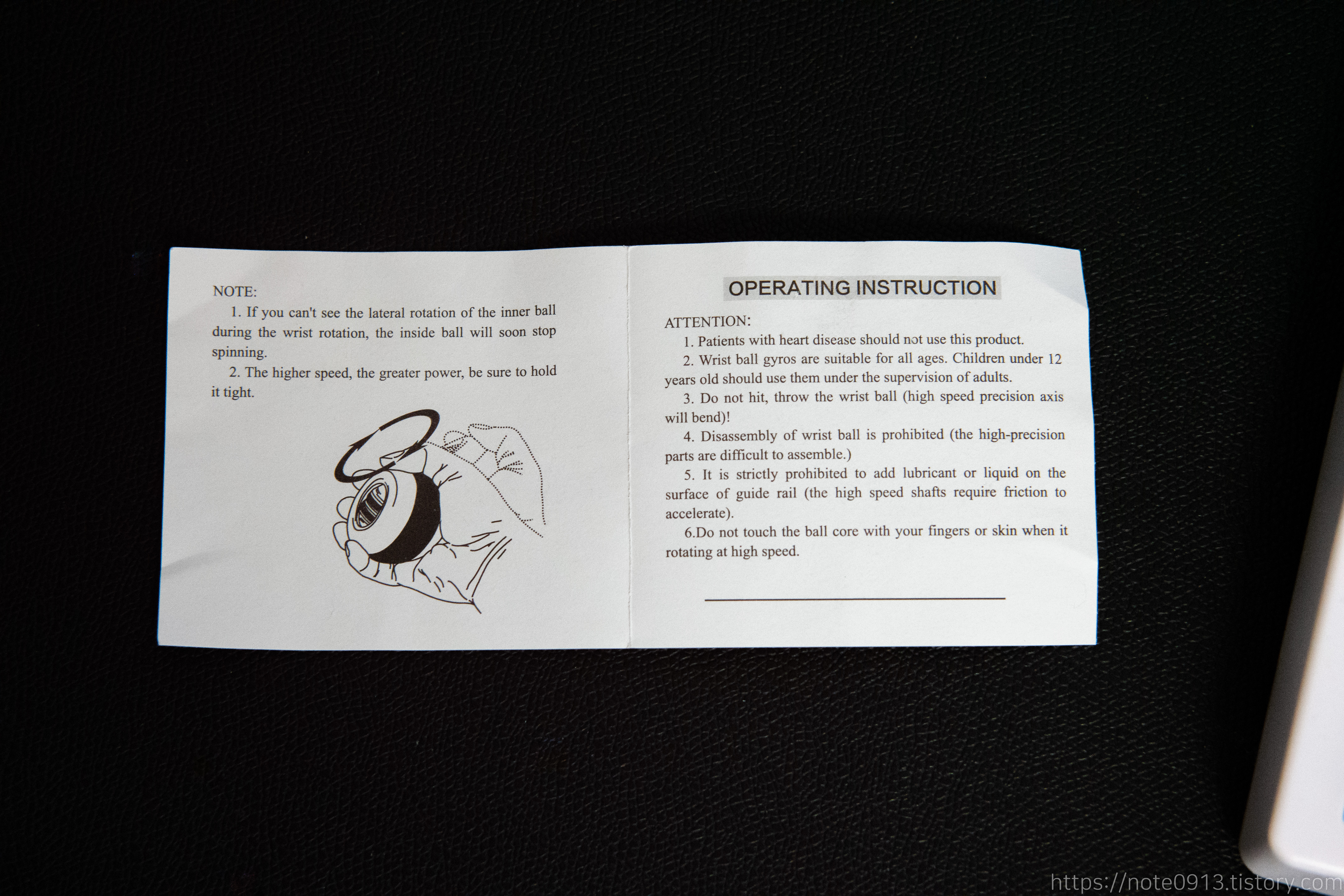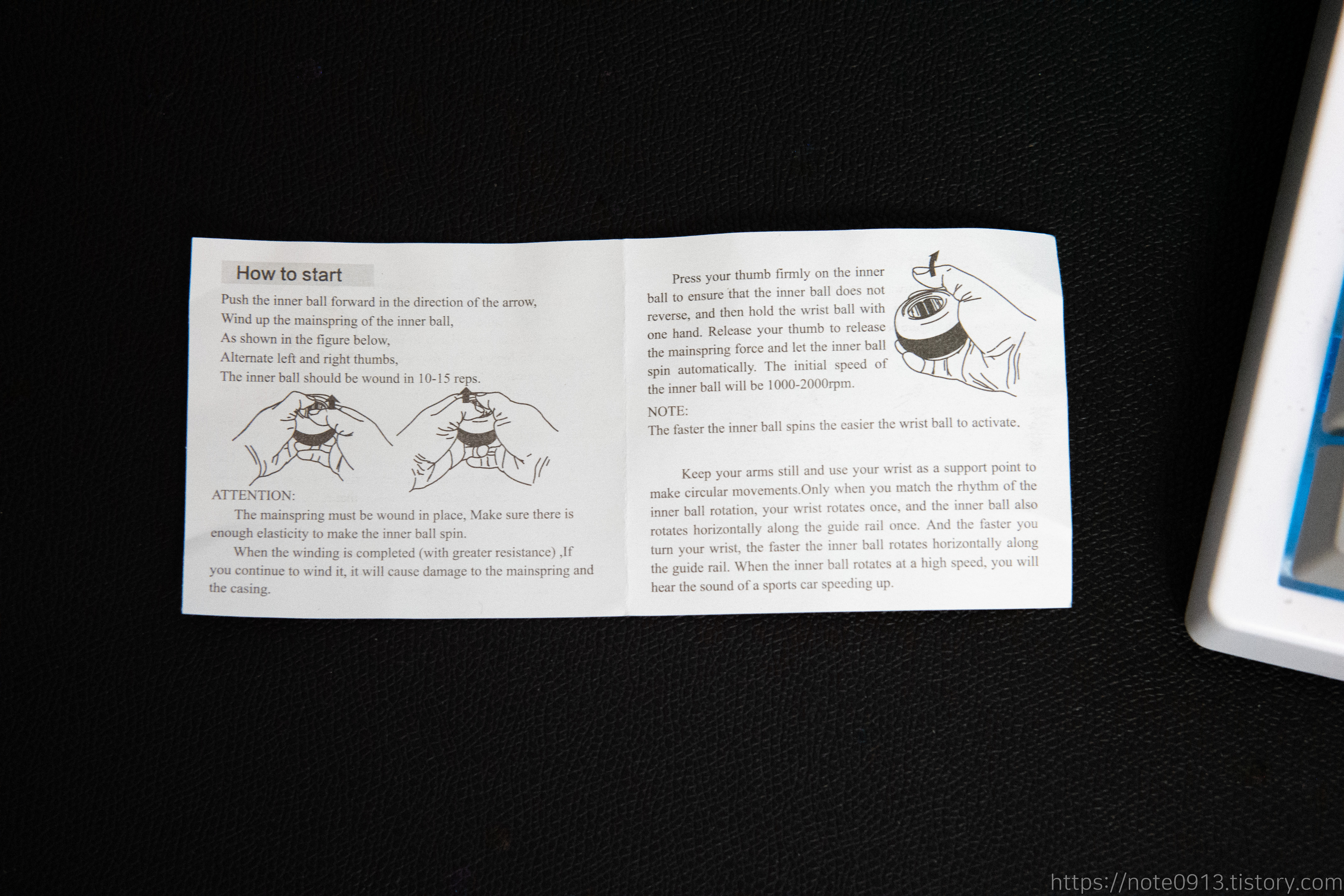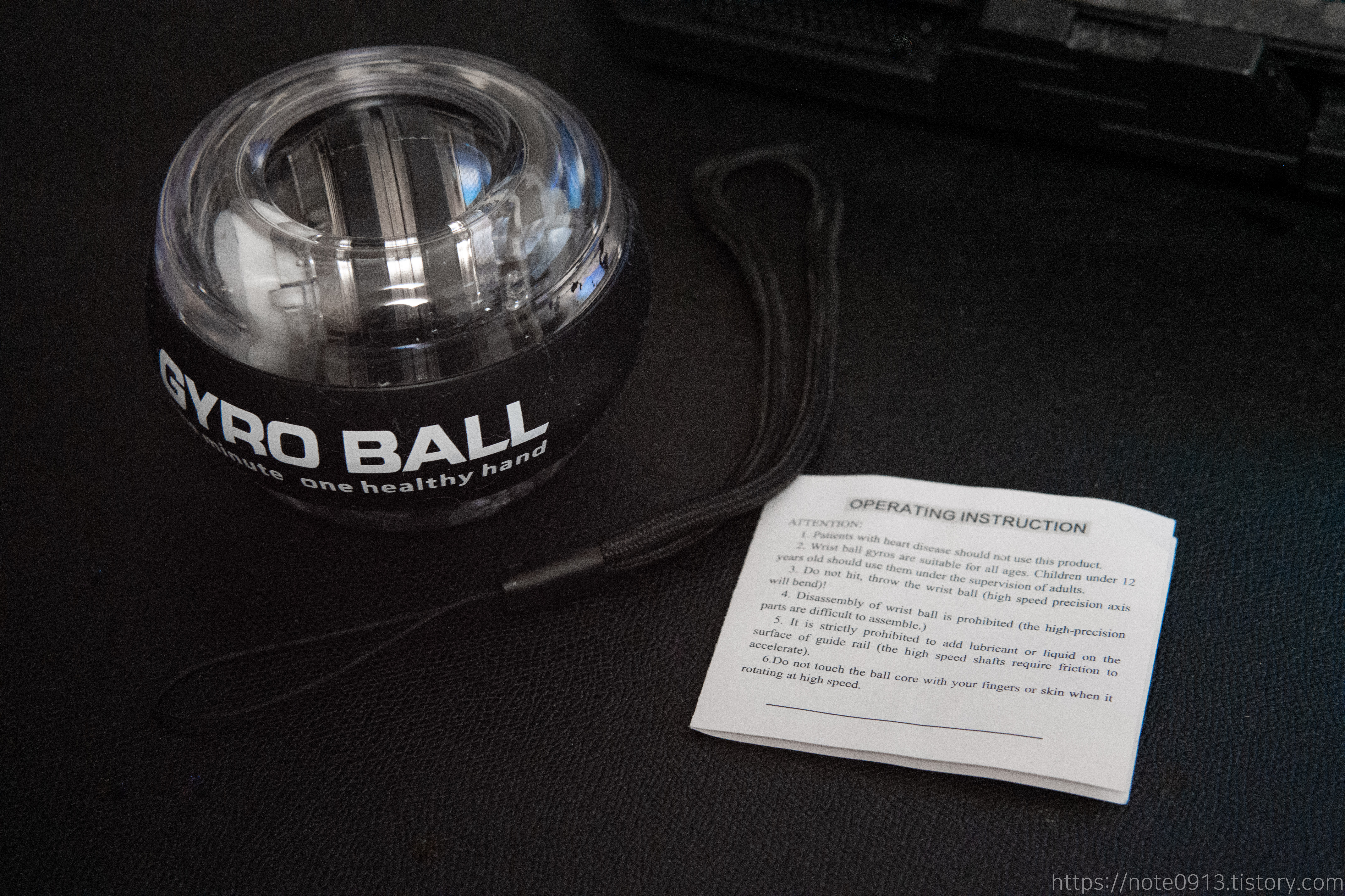 내용물은 자이로 볼 본체와 손목 스트랩, 설명서로 구성되어 있습니다.