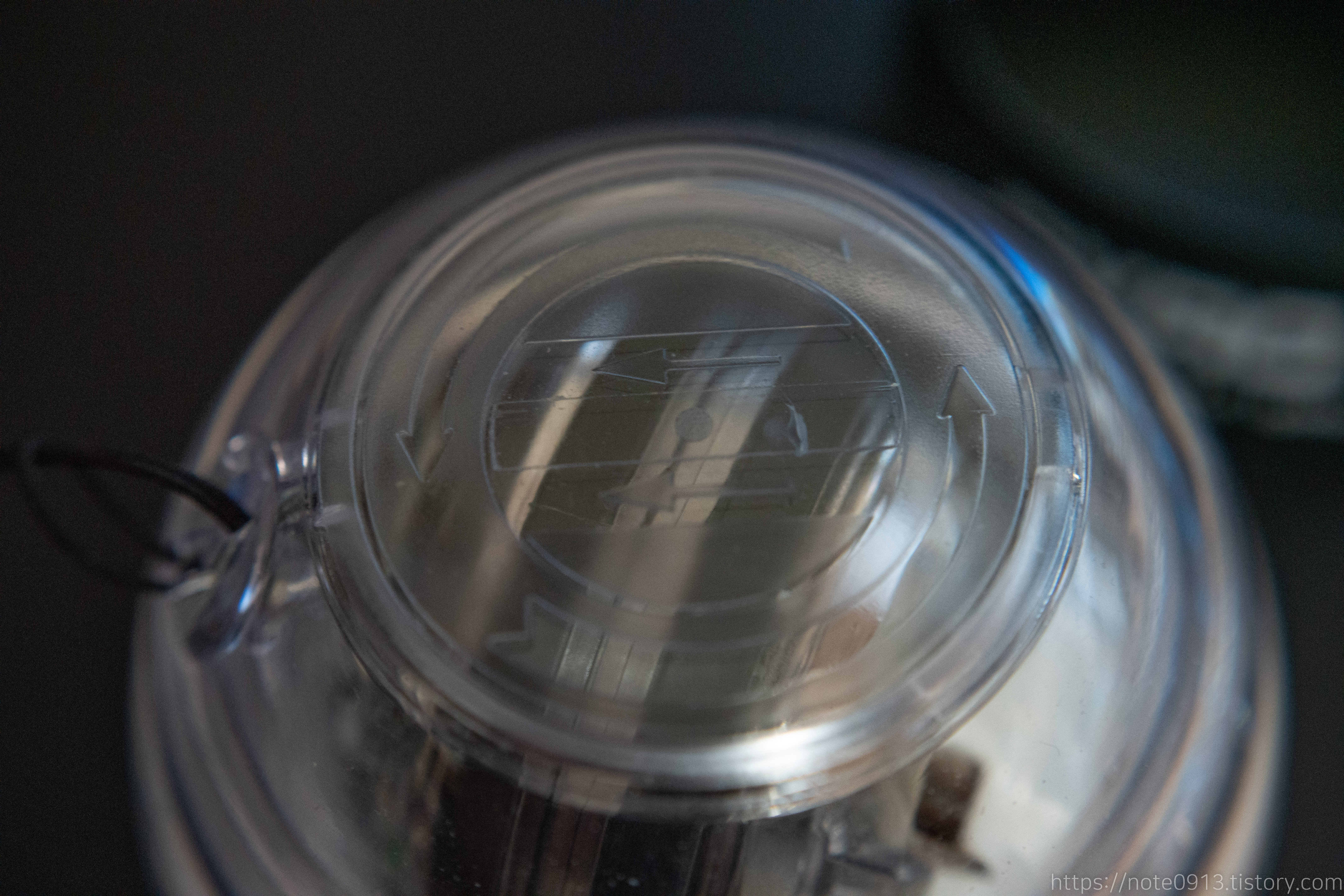 아래 부분입니다. 밑부분에 회전방향을 표시하는 그림이 각인되어 잇습니다. 또한 핸드 스트랩을 연결할 수 있는 구멍이 있습니다.