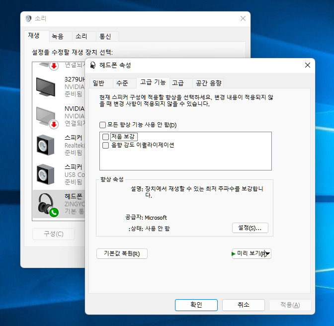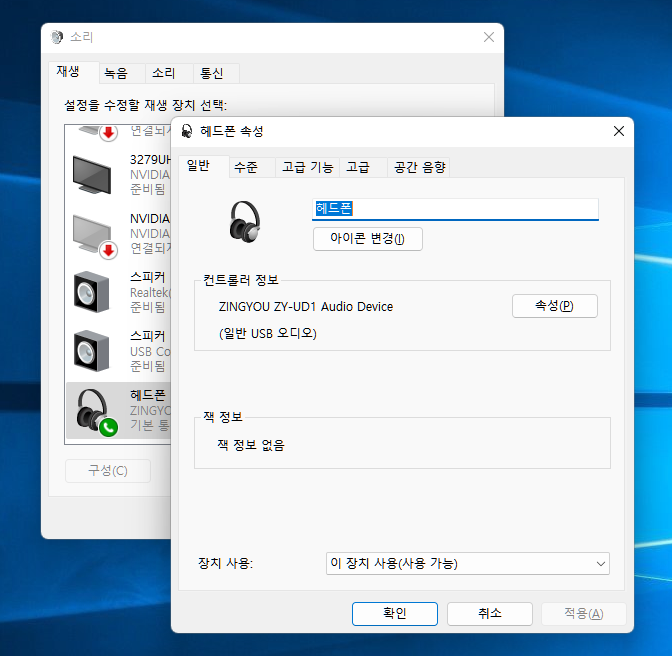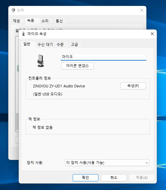 PC 연결시 재생장치는 해드폰으로 인식되고 녹음장치는 마이크로 인식됩니다. 이름은 ZINGYOU ZY-UD1 Audio Device 로 나타납니다. 대부분 출력장치는 스피커로 나타나는데 이 마이크는 헤드폰으로 나타나네요.
