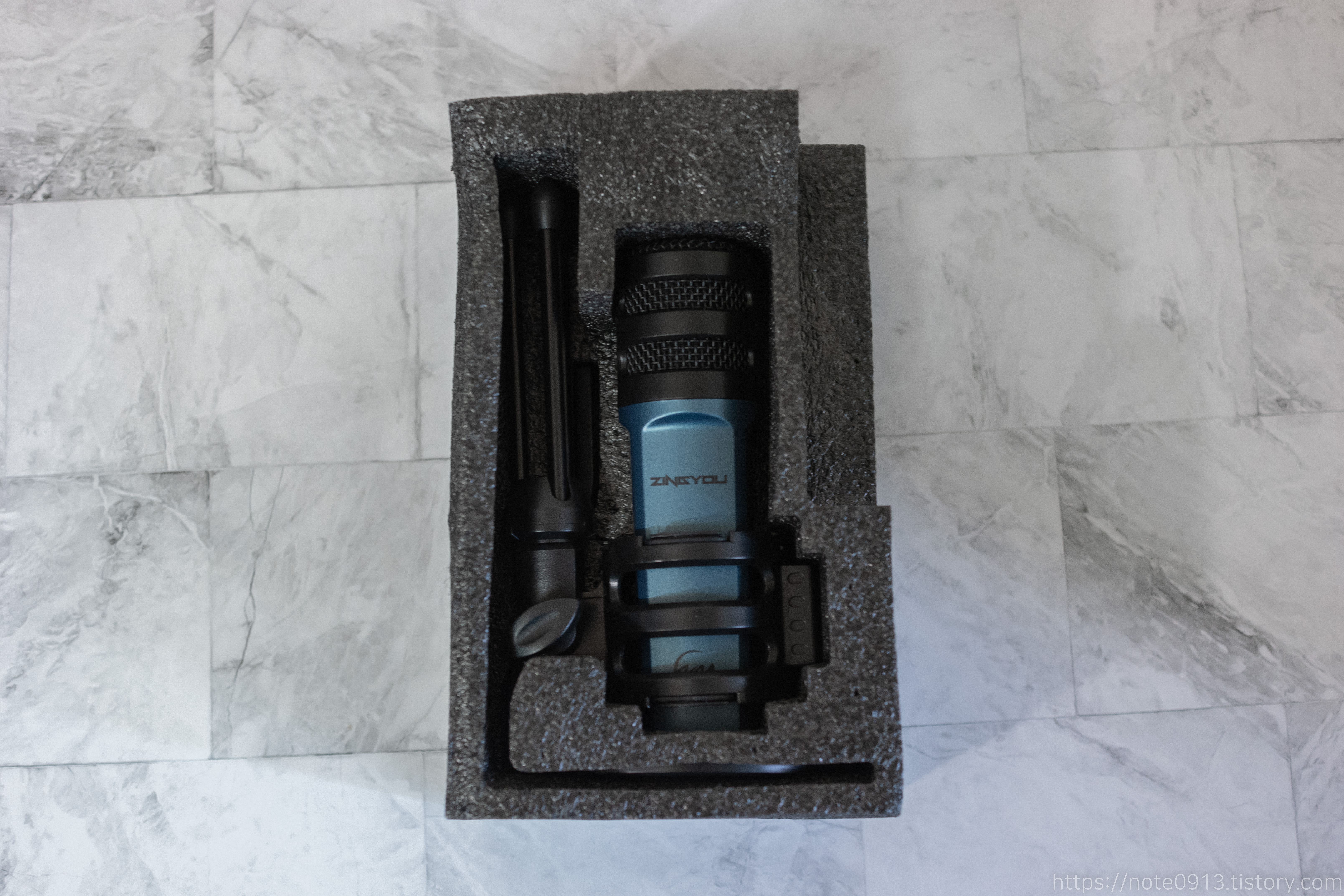 스펀지로 포장된 것은 마이크와 스탠드, 쇼크마운트가 들어있습니다.