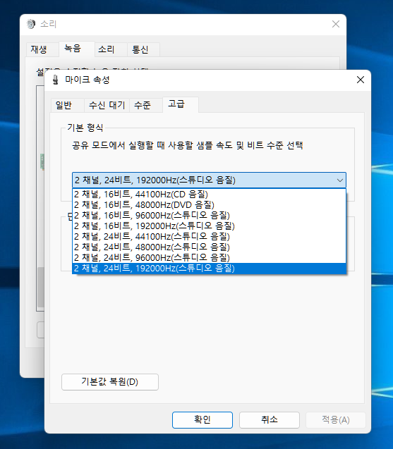 녹음 역시 2채널, 24비트 192000Hz로 설정이 가능합니다.