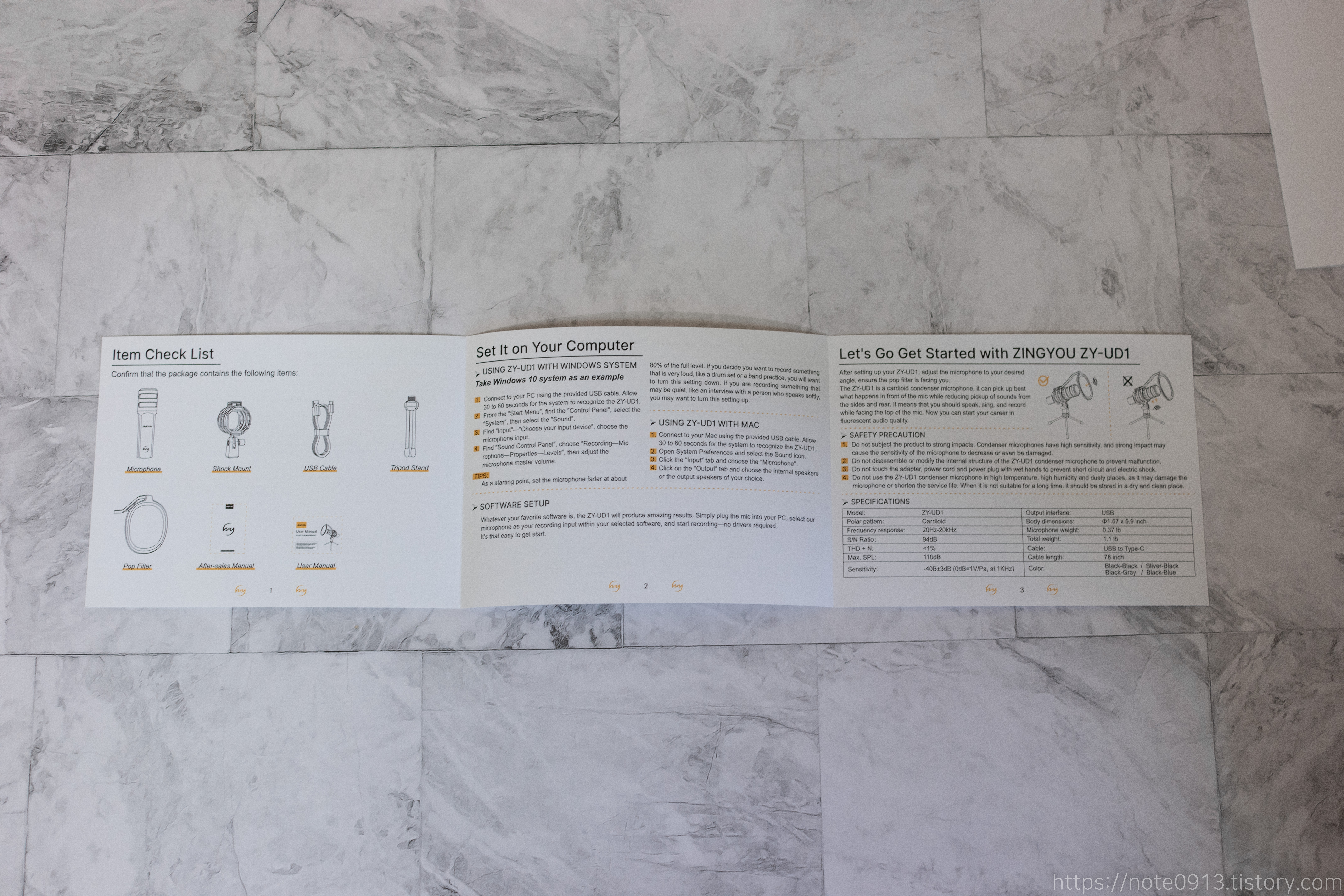 내용물은 콘덴서 마이크, 마이크 스탠드, 쇼크마운트, 설명서, 보증서, USB type C 케이블 입니다.
