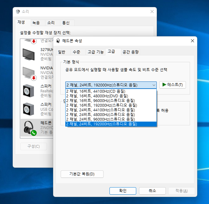 출력은 최대 2채널, 24비트, 19200Hz로 설정이 가능합니다.