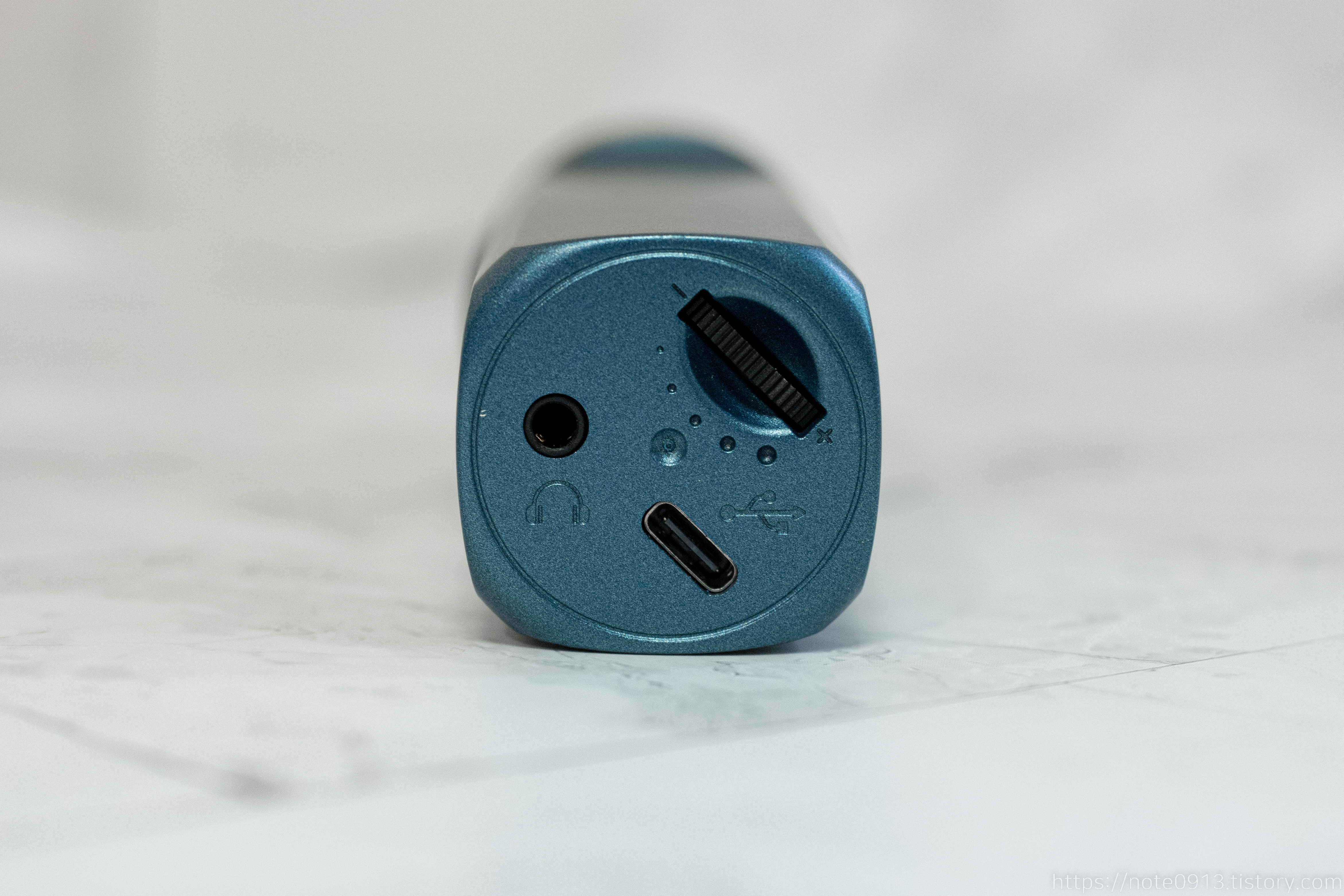 아래쪽에는 마이크 게인 조절 다이얼, 3.5mm 모니터링 단자와 PC와 연결할 수 있는 USB Type C 단자가 있습니다.