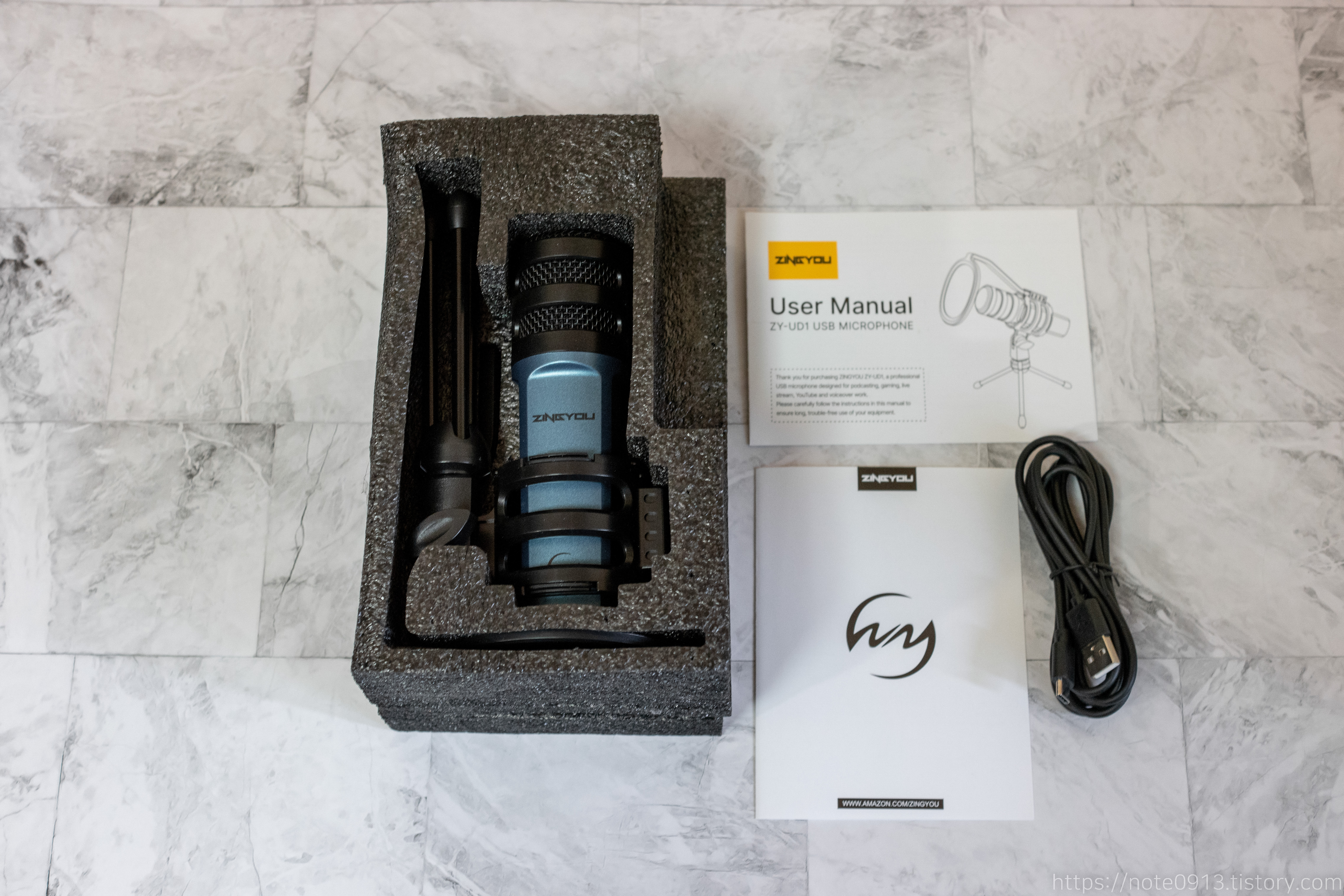 마이크 모양은 윗부분은 원통형이고 아래쪽은 사각형의 형태를 하고 있습니다. 회사이름이 ZINGYOU 인가 봅니다. ZINGYOU라는 글자가 적혀있네요.