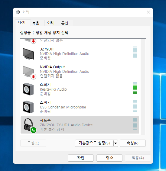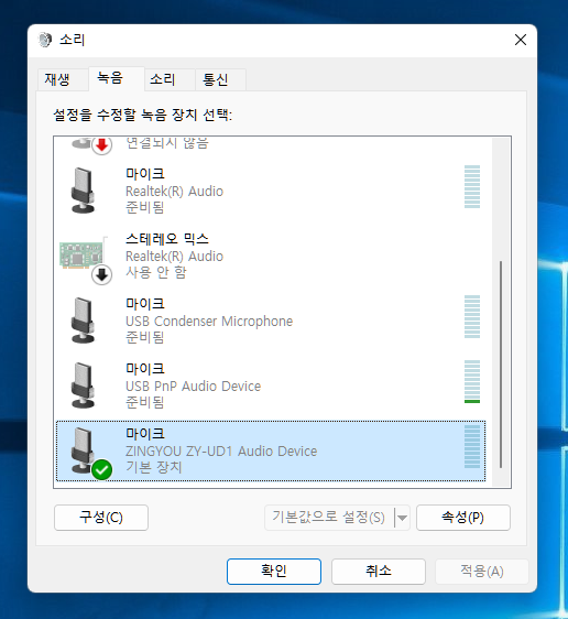 PC 연결시 재생장치는 해드폰으로 인식되고 녹음장치는 마이크로 인식됩니다. 이름은 ZINGYOU ZY-UD1 Audio Device 로 나타납니다. 대부분 출력장치는 스피커로 나타나는데 이 마이크는 헤드폰으로 나타나네요.