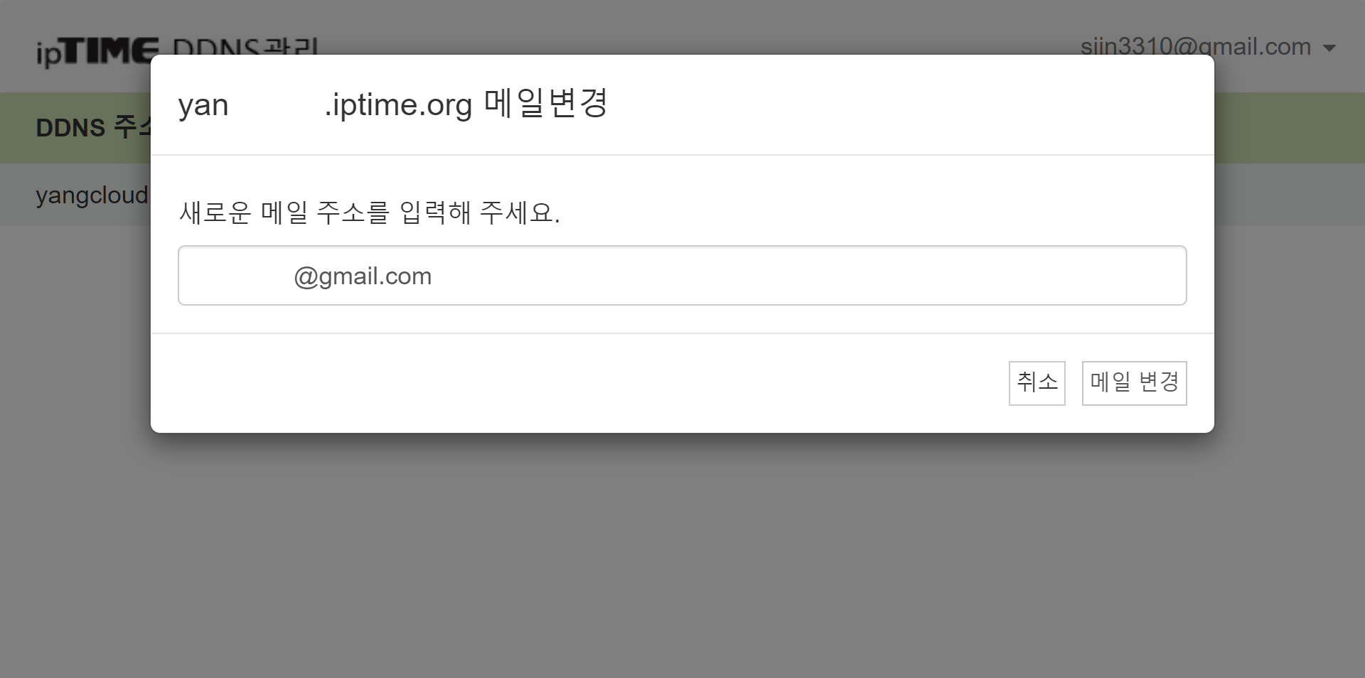 변경 메뉴클릭 시 DDNS에 등록된 이메일 주소를 변경할 수도 있습니다.