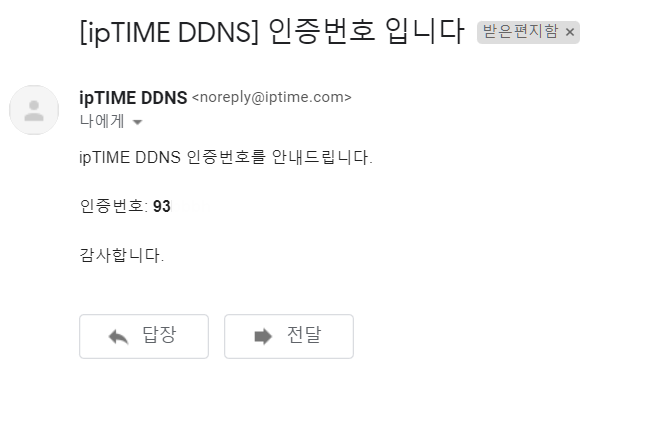 왼쪽의 보안문자를 입력하고 DDNS를 등록할 때 입력한 이메일 주소를 입력합니다.
