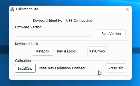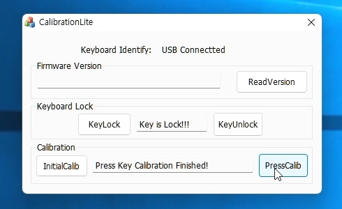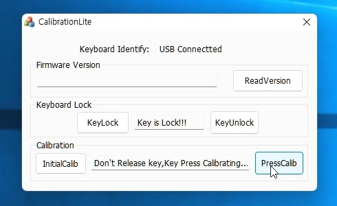 PressCalib 버튼을 누르면 Don't Release key, Key Press Calibrating... 이라는 문구가 나타납니다. 이 문구가 사라질 때까지 키를 계속 누르고 있어여 합니다 .