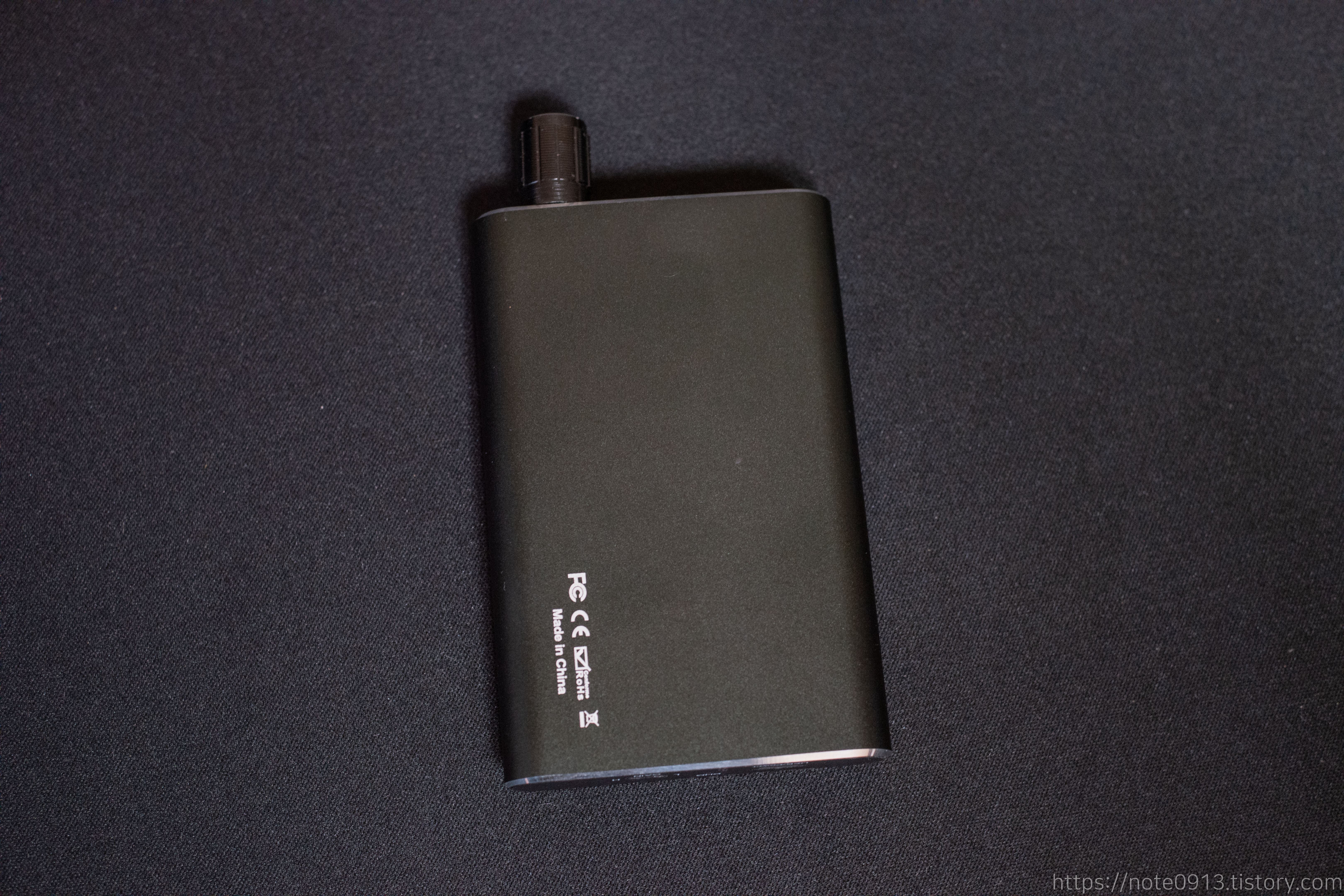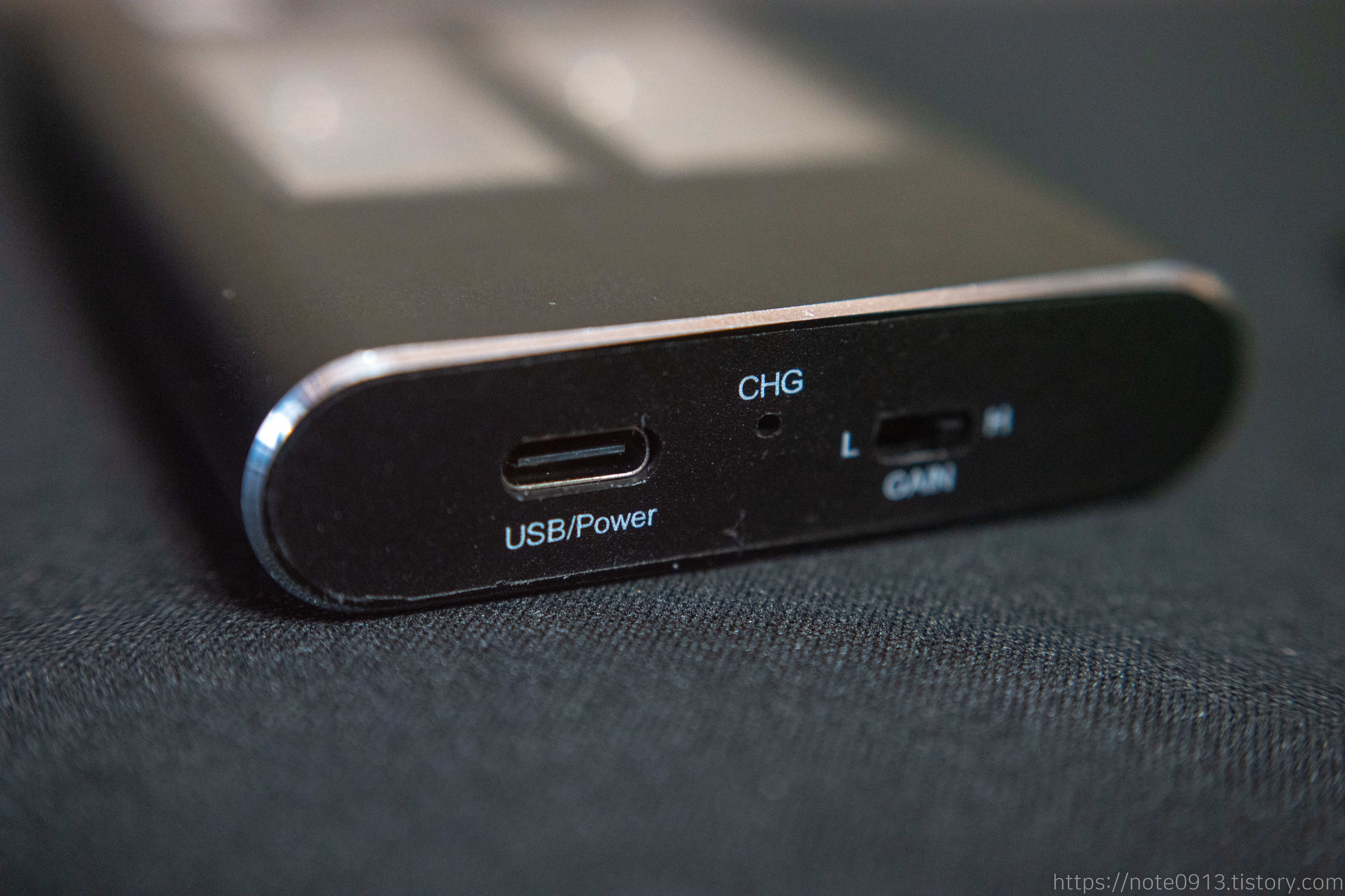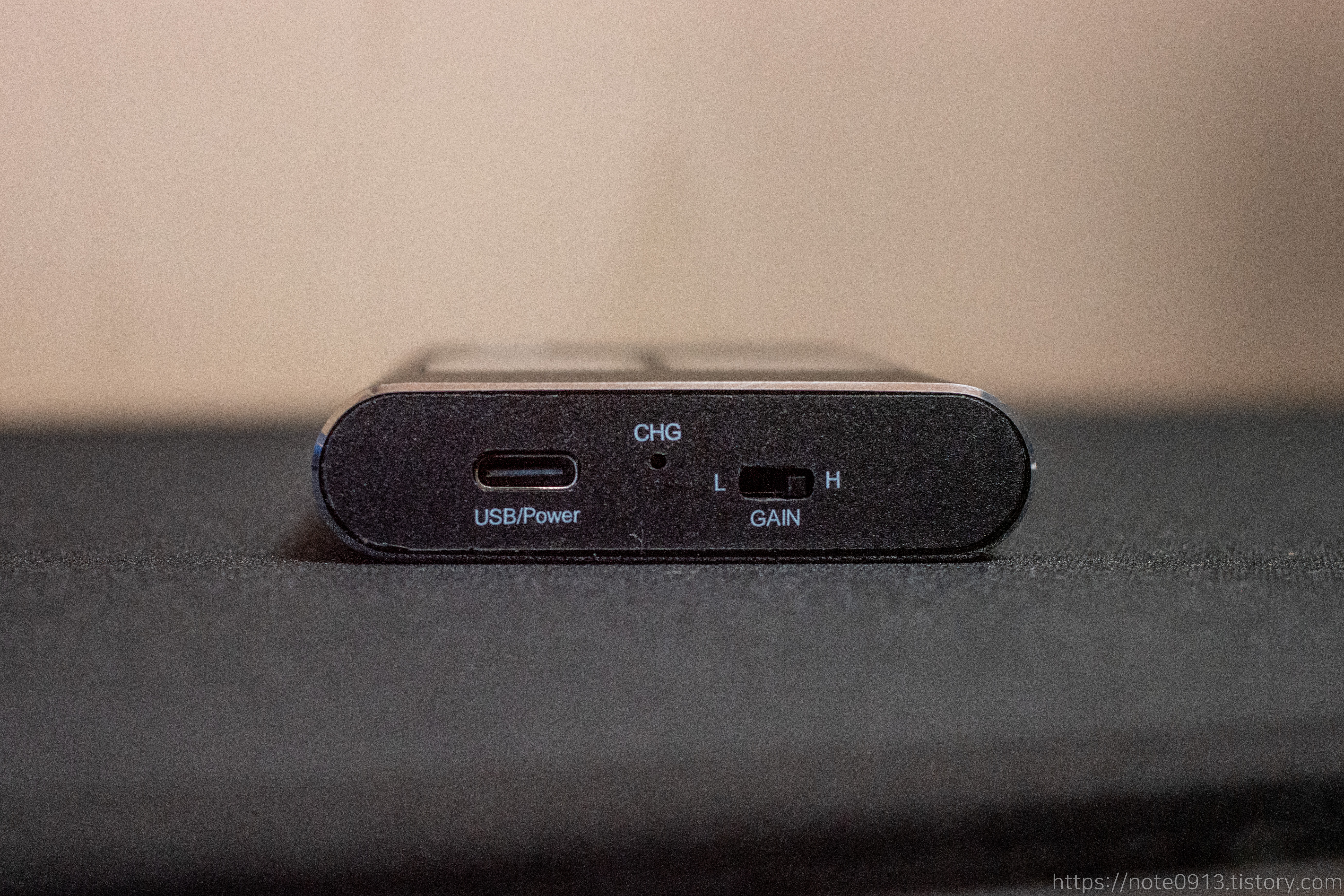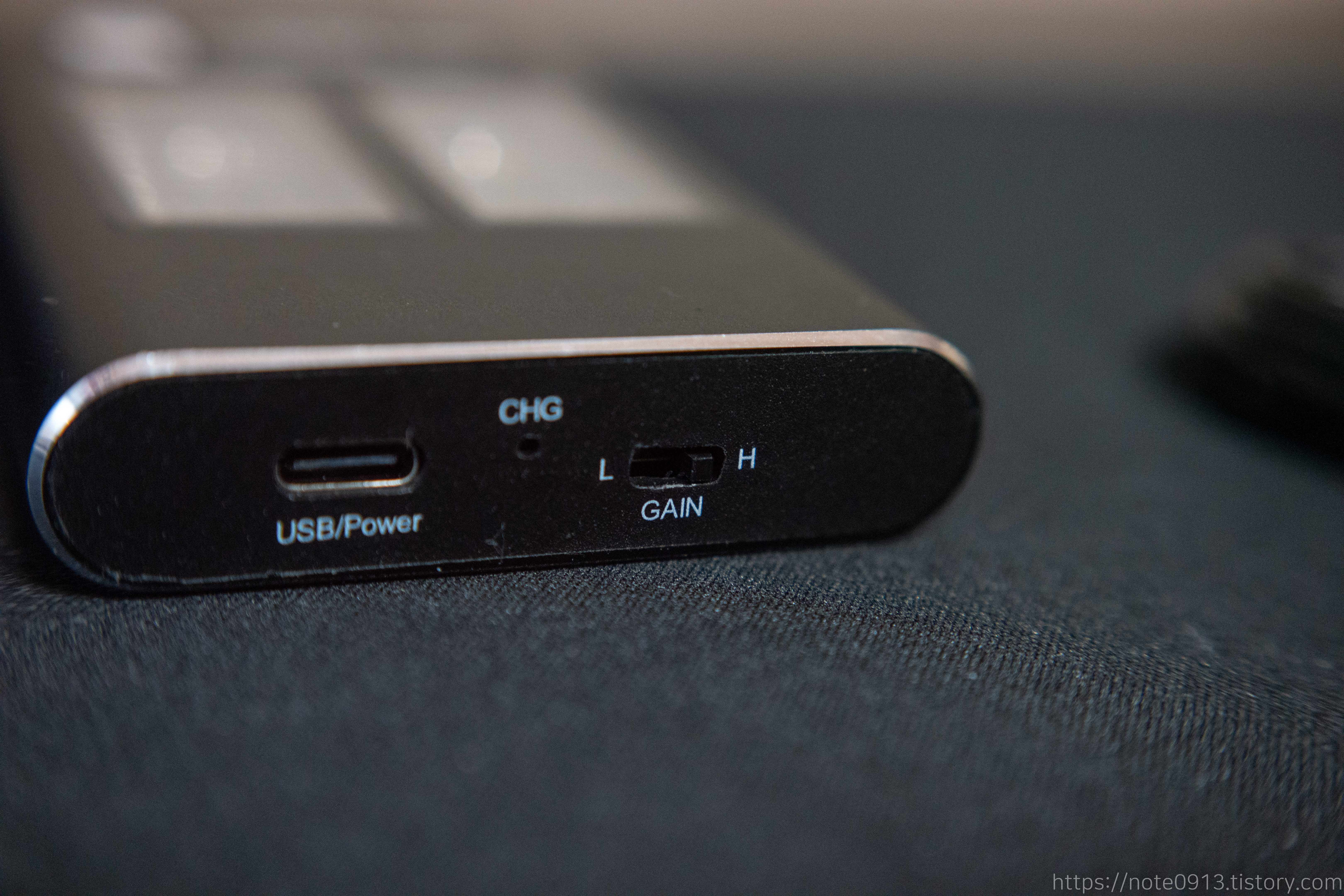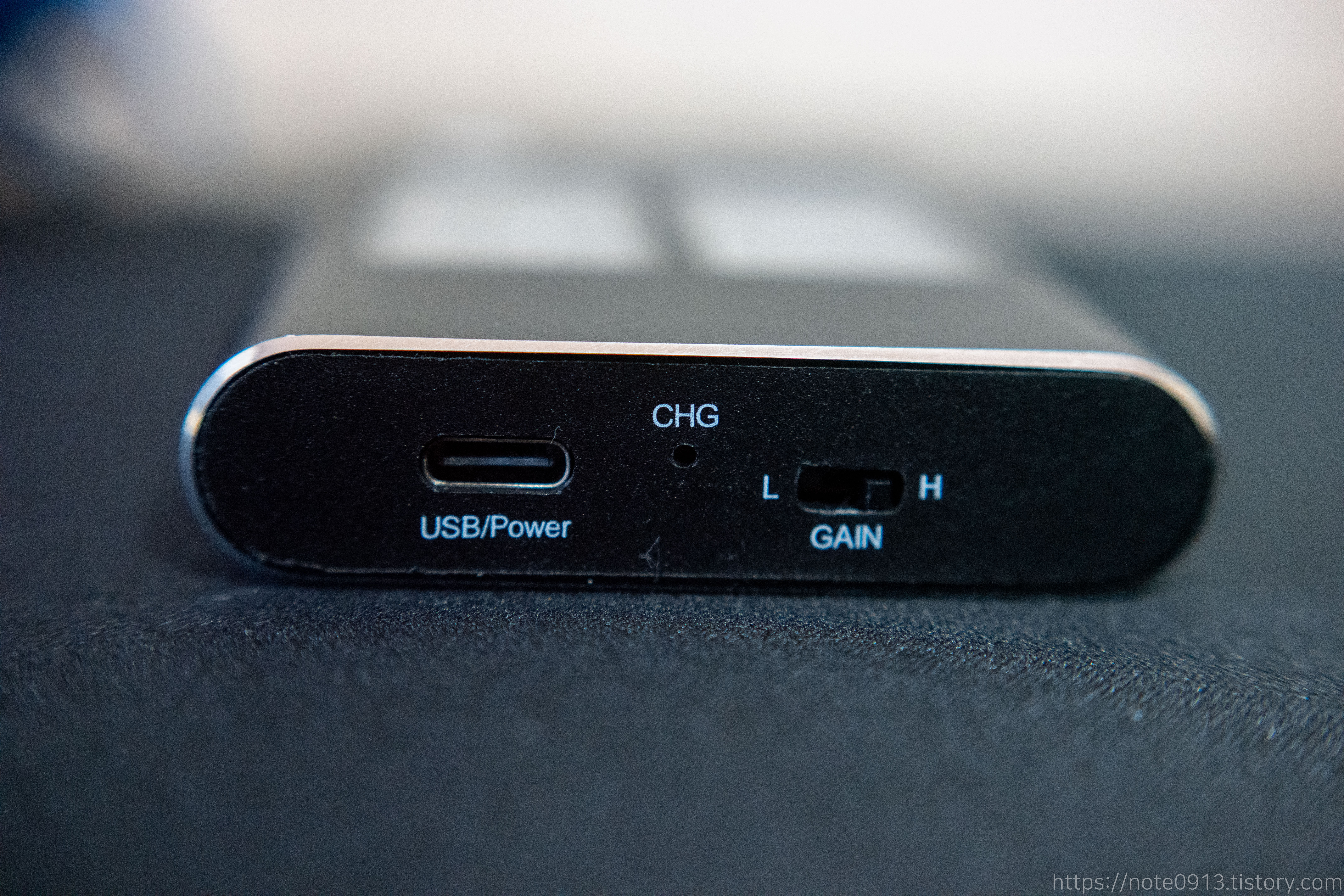 아래쪽에는 USB Type C 포트가 있고 충전 확인 LED와 게인 조절 스위치가 있습니다. 윗면과 아래쪽은 플라스틱으로 구성되어 있습니다.