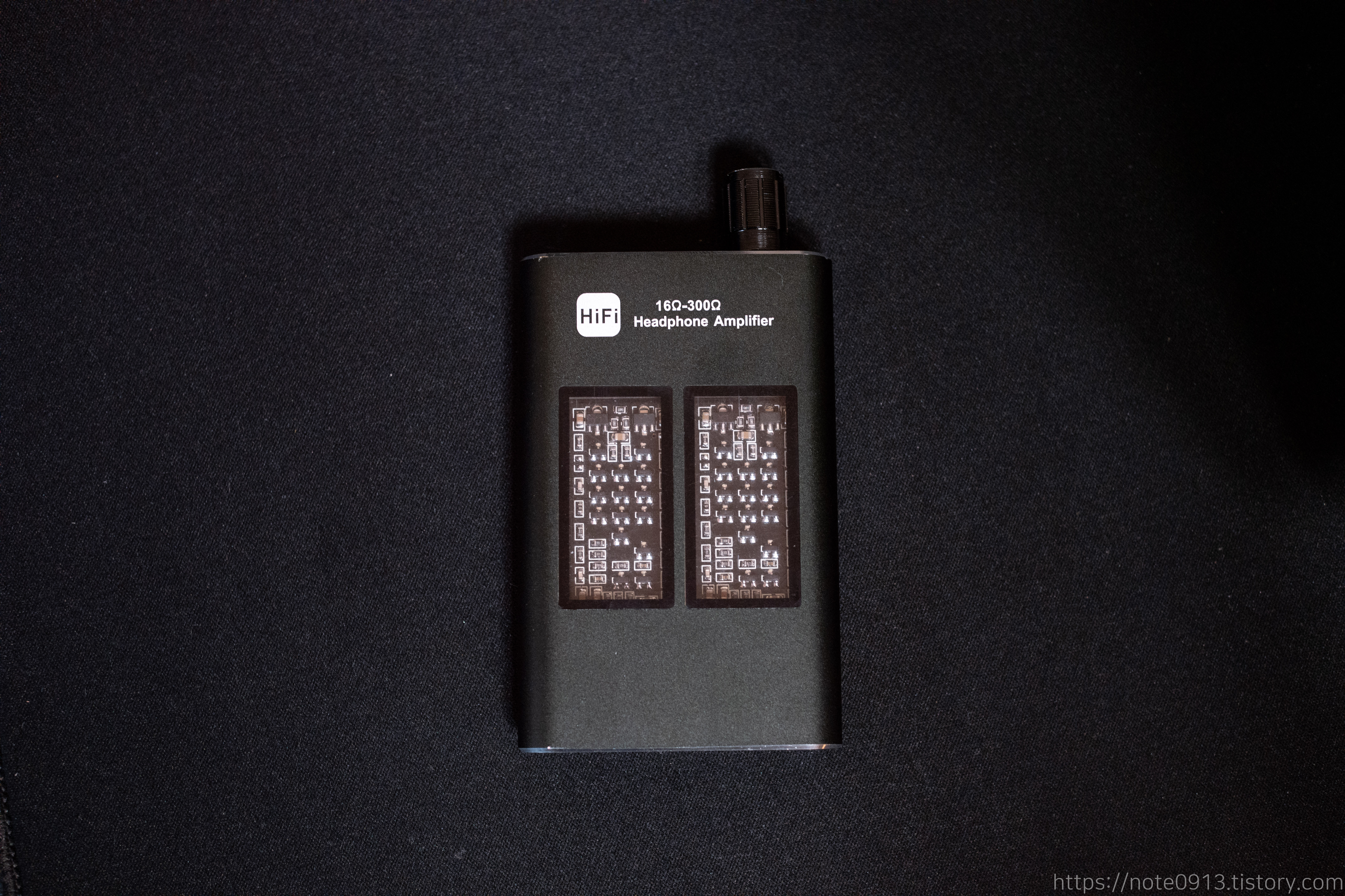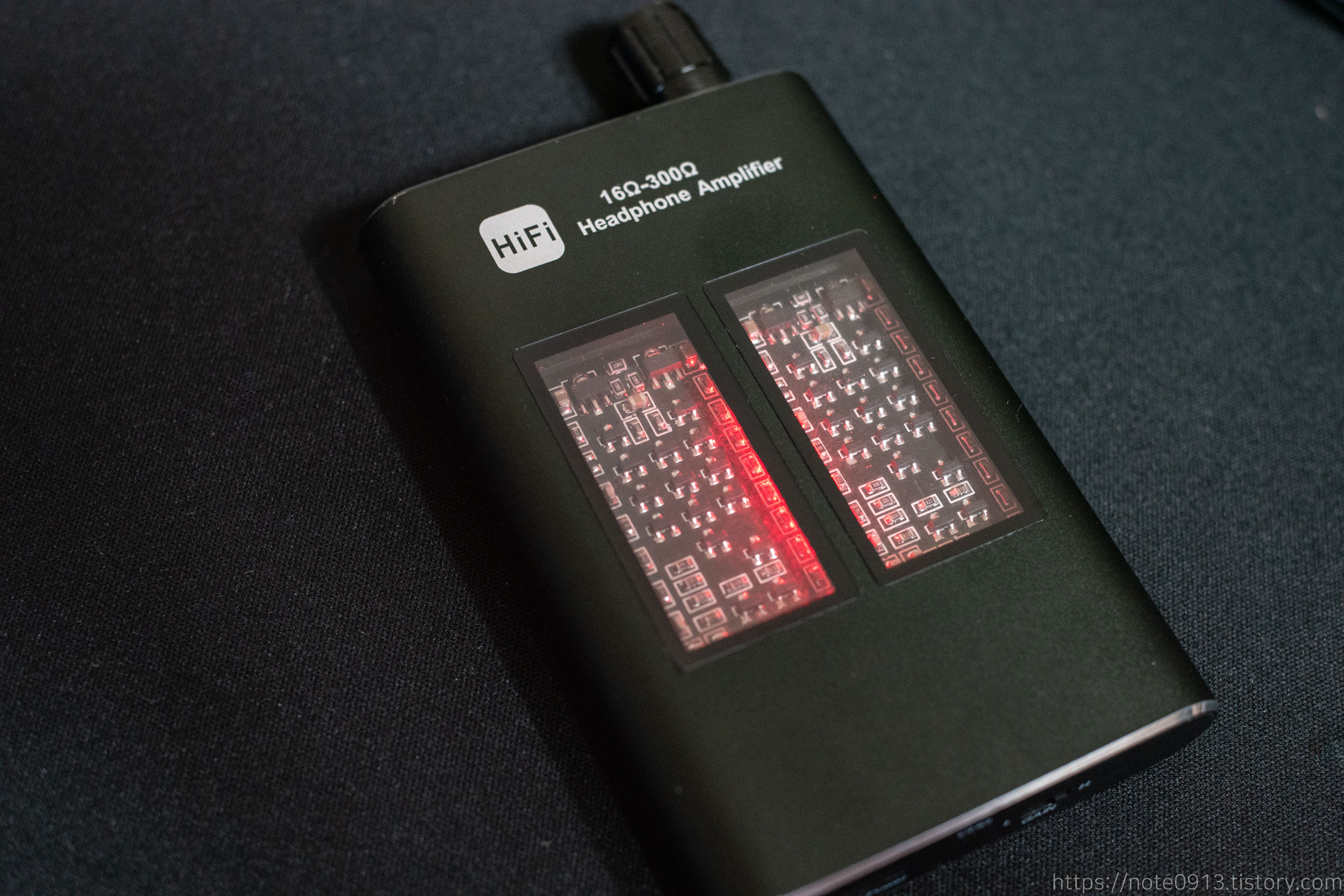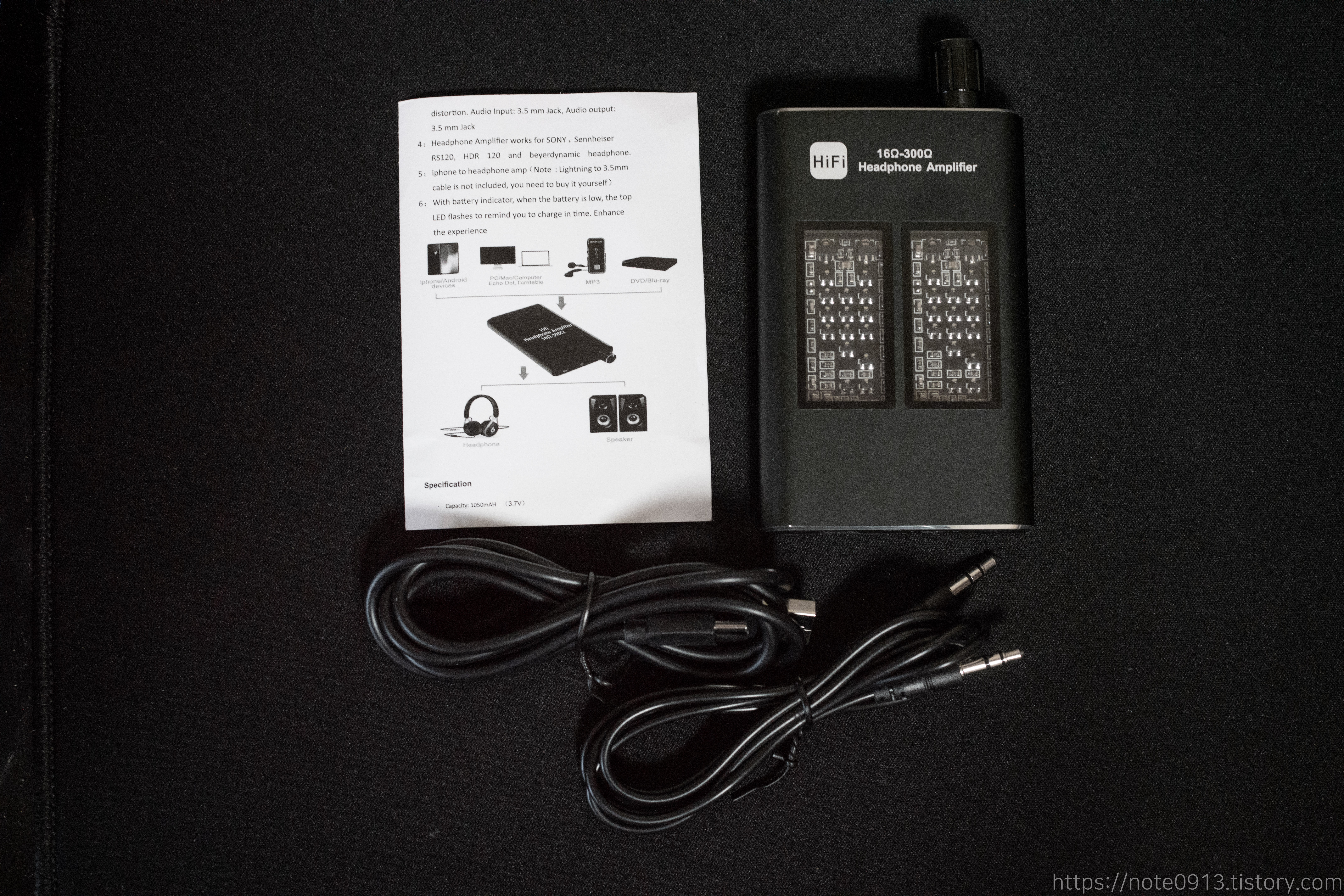 앰프 모습입니다. 크기는 한손에 쥐기 쉬운 크기입니다. 제품 설명 페이지에는 16 - 150Ω 이라고 적혀있는데 실제로 온 건 16 - 300Ω 이라고 적혀 있네요.