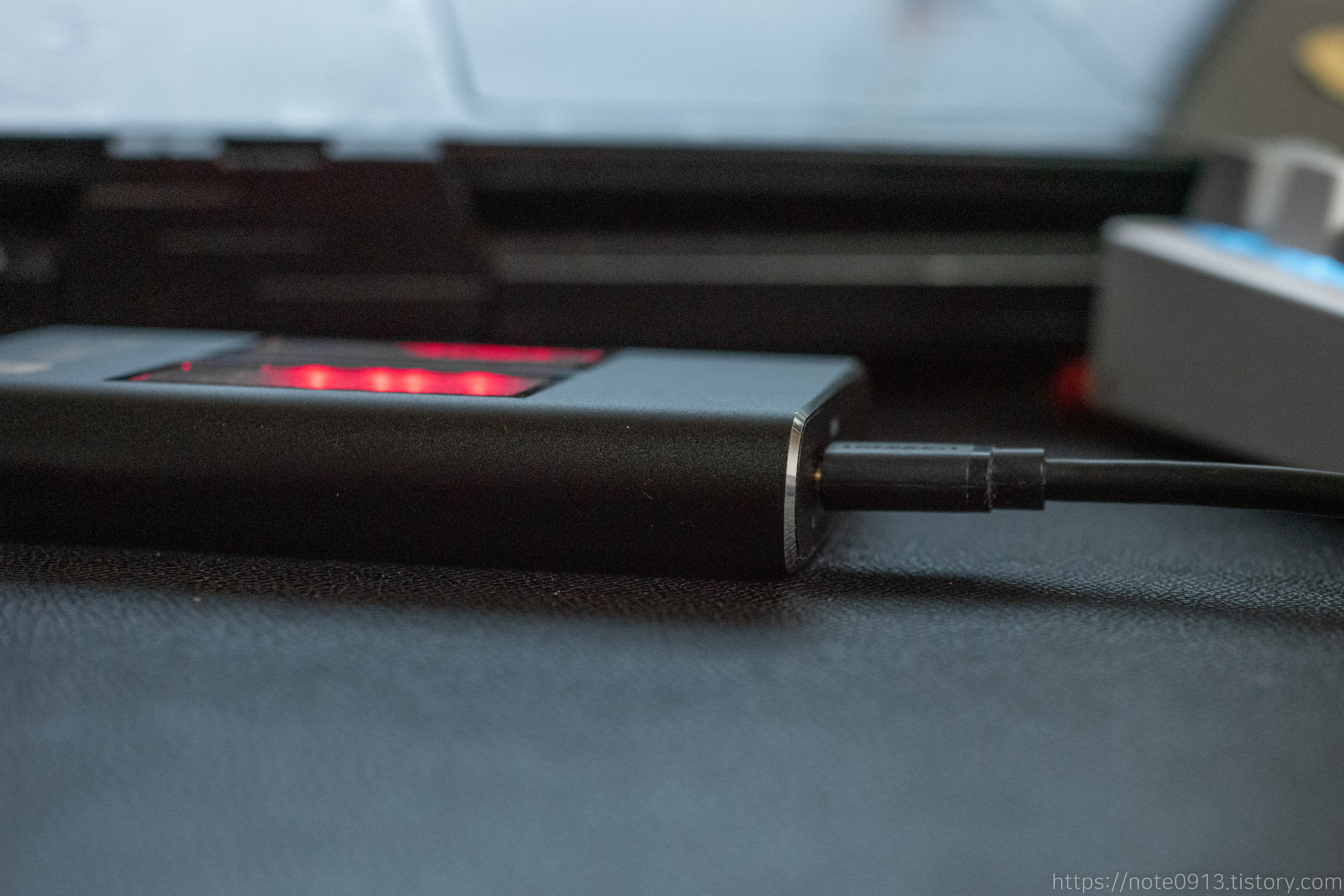 C 타입케이블을 연결하면 충전이 됩니다. 충전 중일 때 CHG라고 표시된 곳에서 빨간색 LED가 점등되고 완충되면 초록색 LED가 점등됩니다.